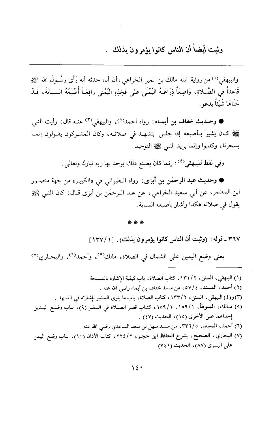• وحديث خفاف بن أيماء: رواه أحمد، والبيهقي عنه قال: رأيت النبي - صلى الله عليه وسلم - كان يشير بأصبعه إذا جلس يتشهد في صلاته، وكان المشركون يقولون إنما يسحرنا، وكذبوا وإنما يريد النبي - صلى الله عليه وسلم - التوحيد.