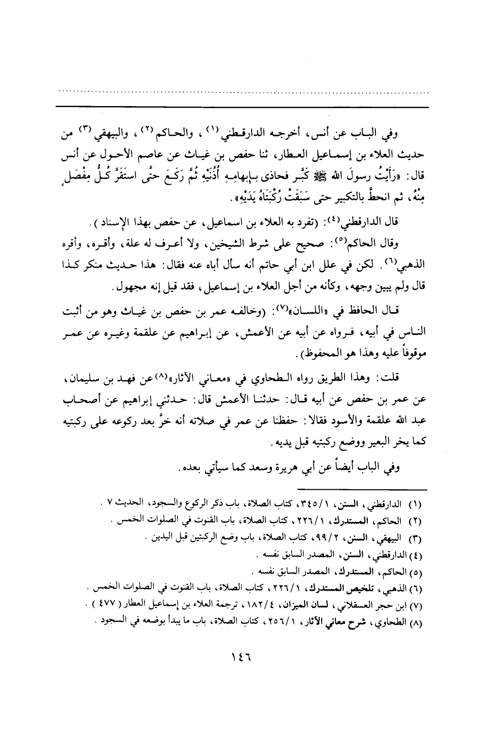 قلت: وهذا الطريق رواه الطحاوي في "معاني الآثار" عن فهد بن سليمان، عن عمر بن حفص عن أبيه قال: حدثنا الأعمش قال: حدثني إبراهيم عن أصحاب عبد الله علقمة والأسود فقالا: حفظنا عن عمر في صلاته أنه خرَّ بعد ركوعه على ركبتيه كما يخر البعير ووضع ركبتيه قبل يديه.