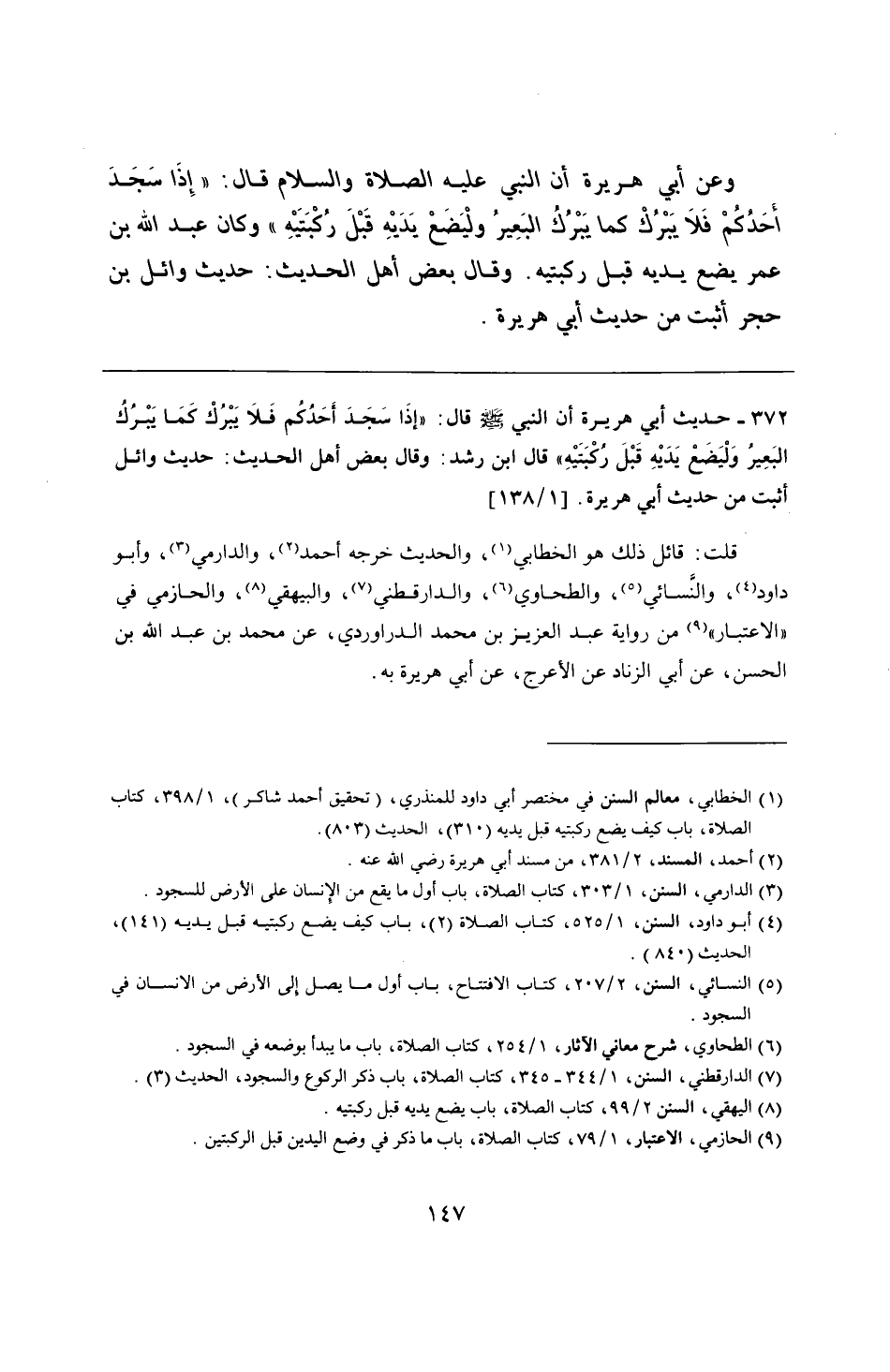 372 - حديث أبي هريرة أن النبي - صلى الله عليه وسلم - قال: "إذَا سَجَدَ أَحَدُكُم فَلاَ يَبْرُكْ كَمَا يَبْرُكُ البَعيِرُ وَليضَعْ يَدَيْهِ قَبْلَ رُكْبَتَيْهِ" قال ابن رشد: وقال بعض أهل الحديث: حديث وائل أثبت من حديث أبي هريرة.