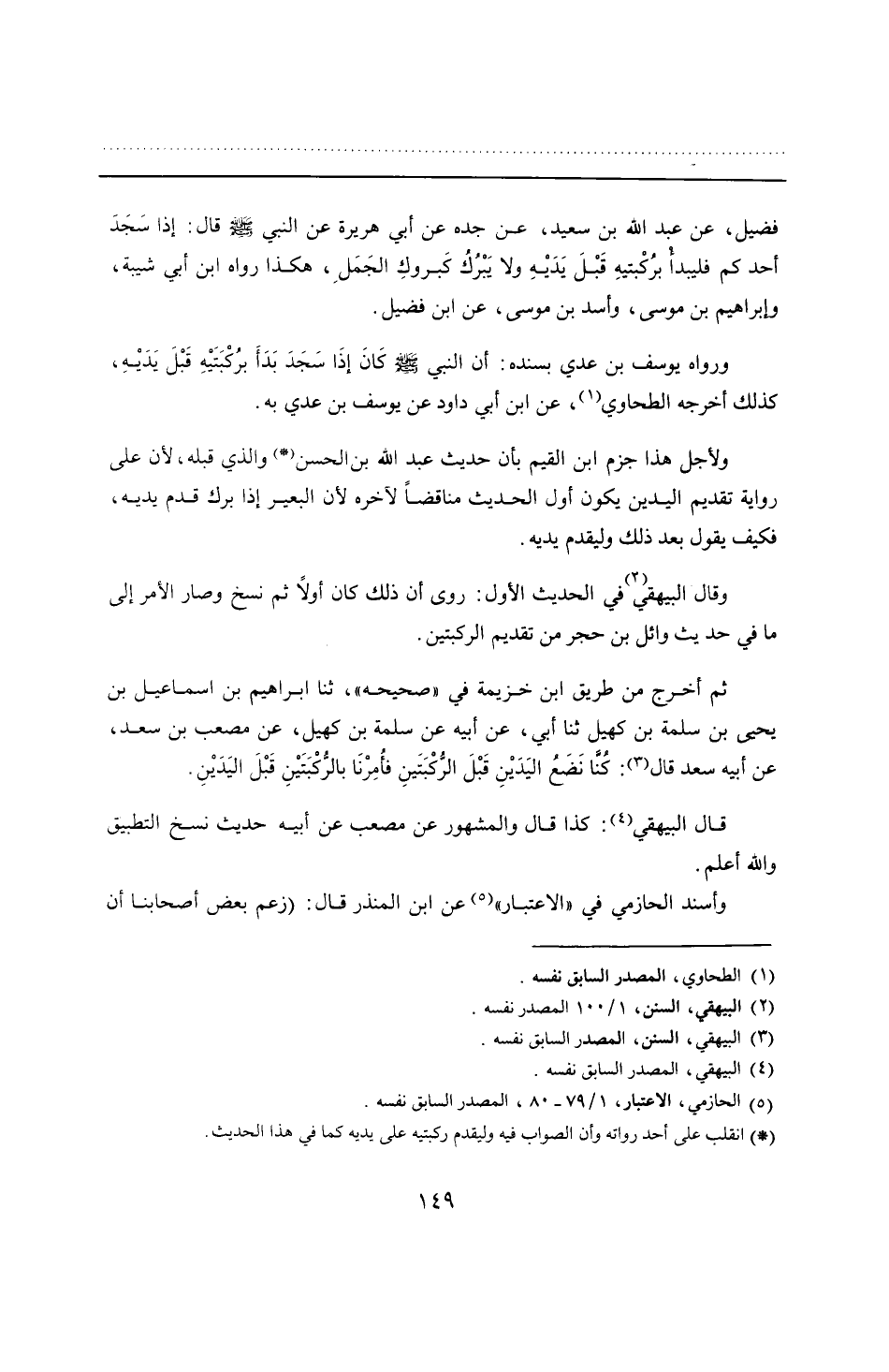ولأجل هذا جزم ابن القيم بأن حديث عبد الله بن الحسن والذي قبله، لأن على رواية تقديم اليدين يكون أول الحديث مناقضًا لآخره لأن البعير إذا برك قدم يديه، فكيف يقول بعد ذلك وليقدم يديه.