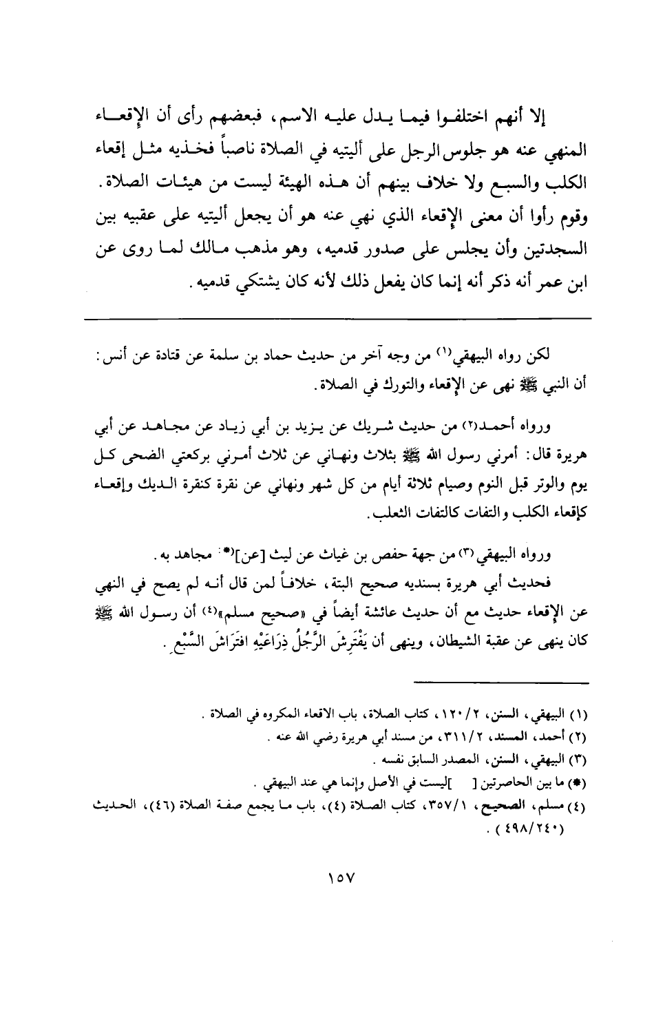فحديث أبي هريرة بسنديه صحيح البتة، خلافًا لمن قال أنه لم يصح في النهي عن الإقعاء حديث مع أن حديث عائشة أيضًا في "صحيح مسلم" أن رسول الله - صلى الله عليه وسلم - كان ينهى عن عقبة الشيطان، وينهى أن يَفْتَرِشَ الرجُل ذِرَاعَيْهِ افتَرَاشَ السَّبْعِ.