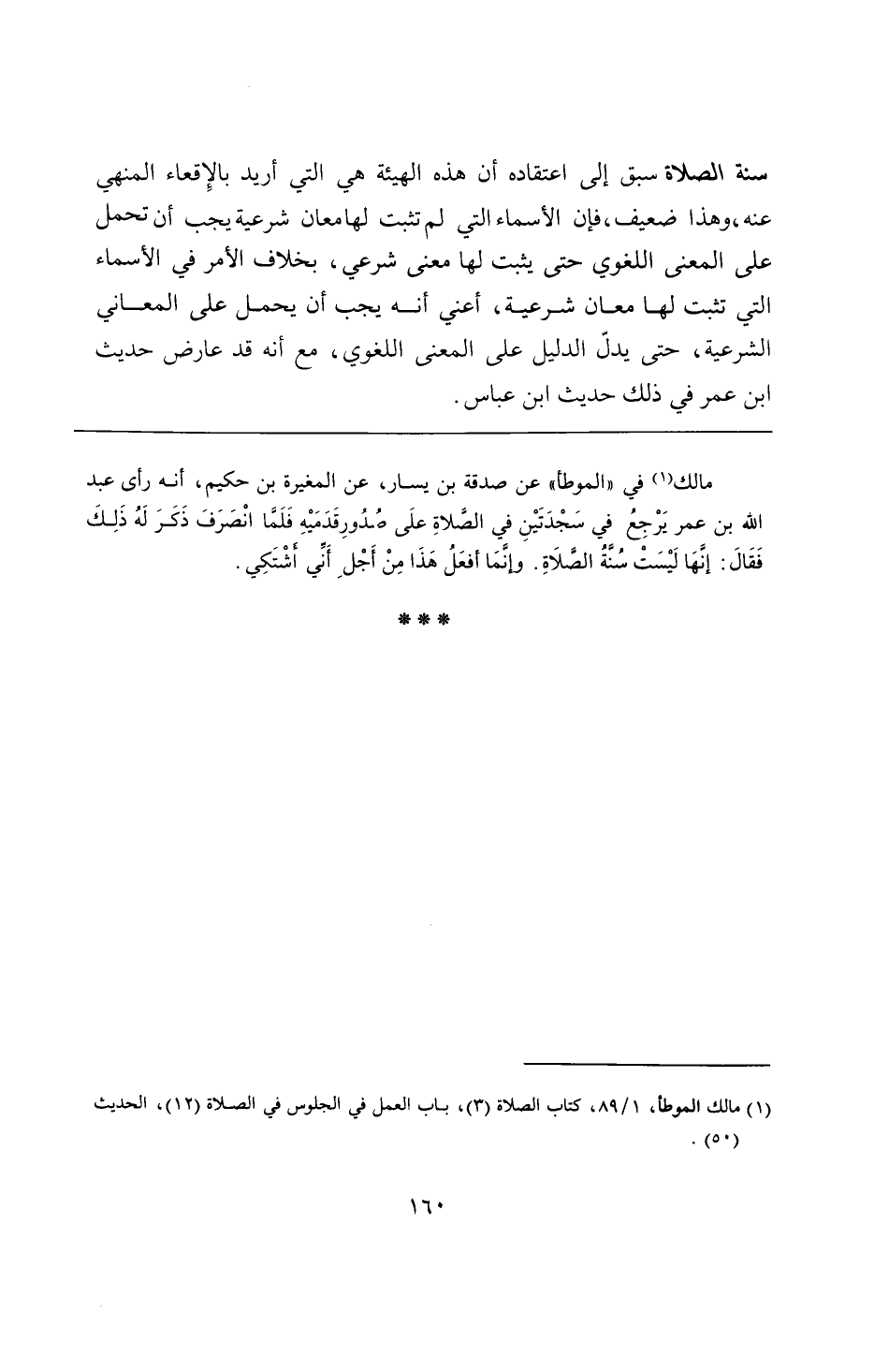 مالك في "الموطأ" عن صدقة بن يسار، عن المغيرة بن حكيم، أنه رأى عبد الله بن عمر يَرْجِعُ في سَجْدَتَيْنِ في الصَّلاةِ علَى صُدُورِ قَدَمَيْهِ فَلَمَّا انْصَرَفَ ذَكَرَ لَهُ ذَلِكَ فَقَالَ: إنَّهَا لَيْسَتْ سُنَّةُ الصَّلَاةِ. وإنَّمَا أفعَلُ هَذَا مِنْ أَجْلِ أَنِّي أَشْتَكِي.