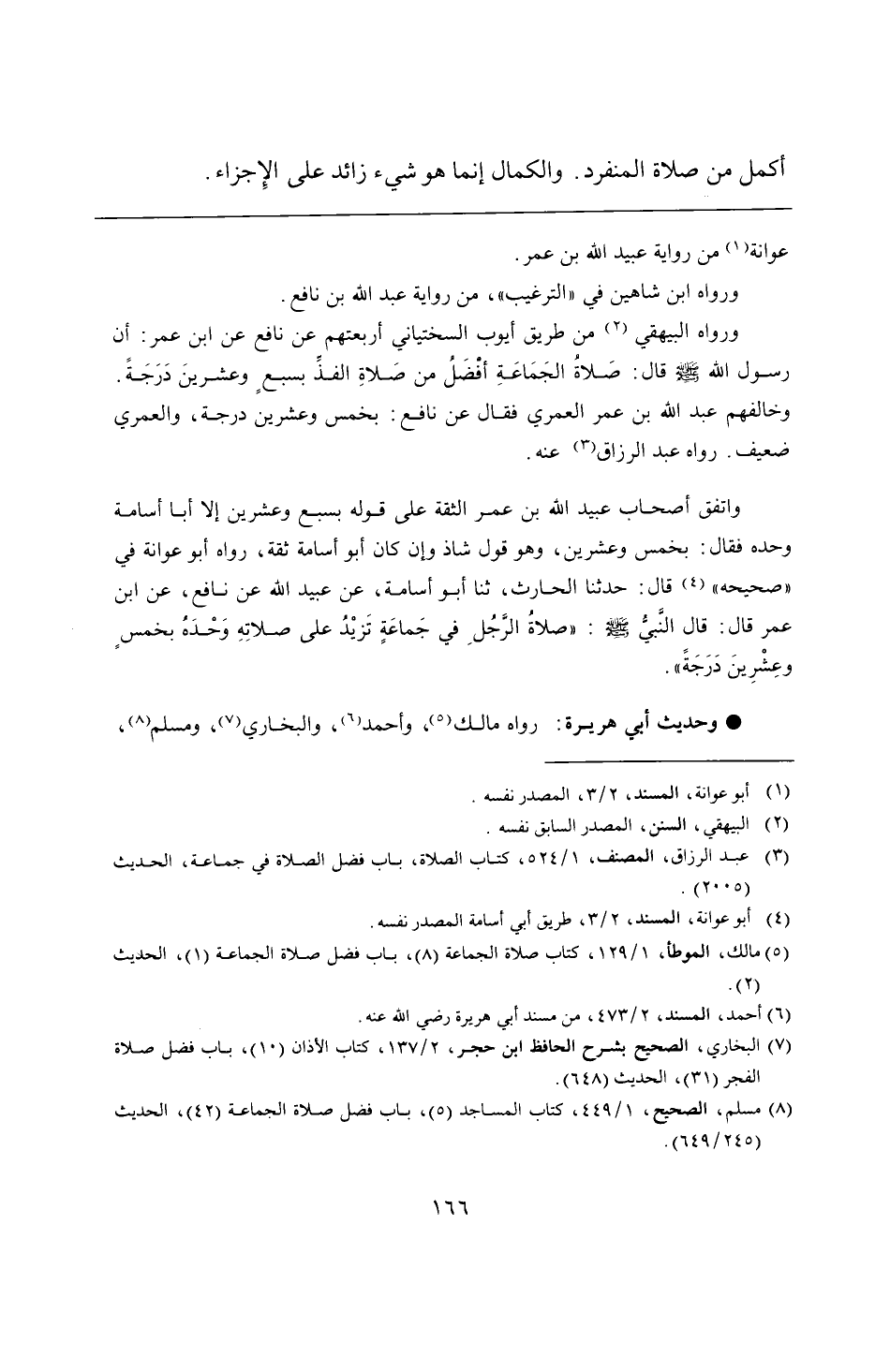 ورواه البيهقي من طريق أيوب السختياني أربعتهم عن نافع عن ابن عمر: أن رسول الله - صلى الله عليه وسلم - قال: صَلاةُ الجَمَاعَةِ أفْضَلُ من صَلاةِ الفذِّ بسبعٍ وعشرينَ دَرَجَةً. وخالفهم عبد الله بن عمر العمري فقال عن نافع: بخمس وعشرين درجة، والعمري ضعيف. رواه عبد الرزاق عنه.