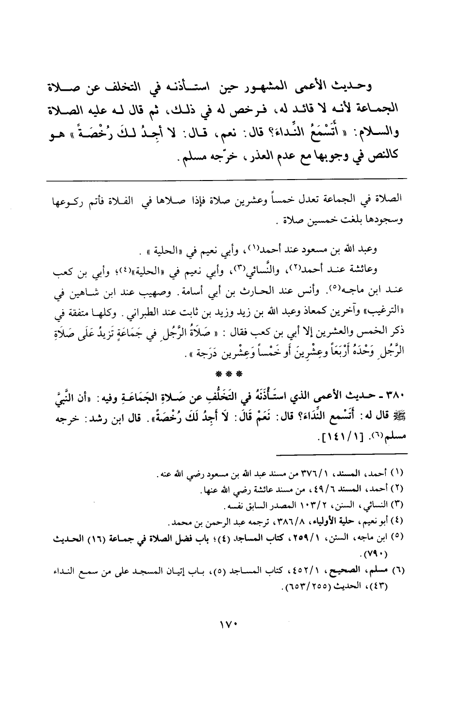 380 - حديث الأعمى الذي استَأْذَنَهُ في التَخَلُّفِ عن صَلاةِ الجَمَاعَةِ وفيه: "أن النَّبيَّ - صلى الله عليه وسلم - قال له: أَتَسْمع النِّدَاءَ؟ قال: نَعَمْ قَالَ: لَا أَجِدُ لَكَ رُخْصَةً". قال ابن رشد: خرجه مسلم.