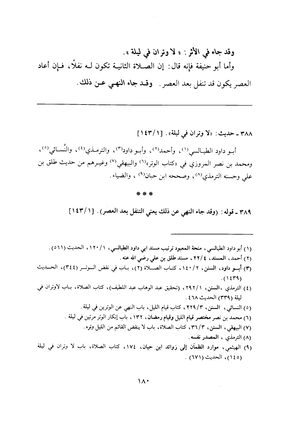 أبو داود الطيالسي، وأحمد، وأبو داود، والترمذي، والنسائي، ومحمد بن نصر المروزي في "كتاب الوتر" والبيهقي وغيرهم من حديث طلق بن علي وحسنه الترمذي، وصححه ابن حبان، والضياء.