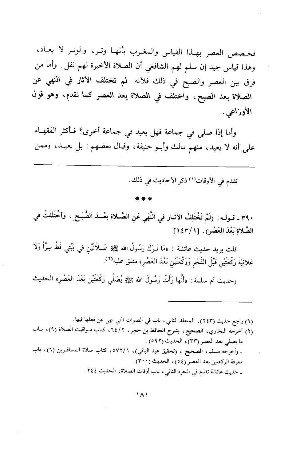 وحديث أم سلمة: "أنَّها رَأَتْ رَسُولَ الله - صلى الله عليه وسلم - يُصَلِّي رَكْعَتَيْنِ بَعْدَ العَصْرِ" الحديث
