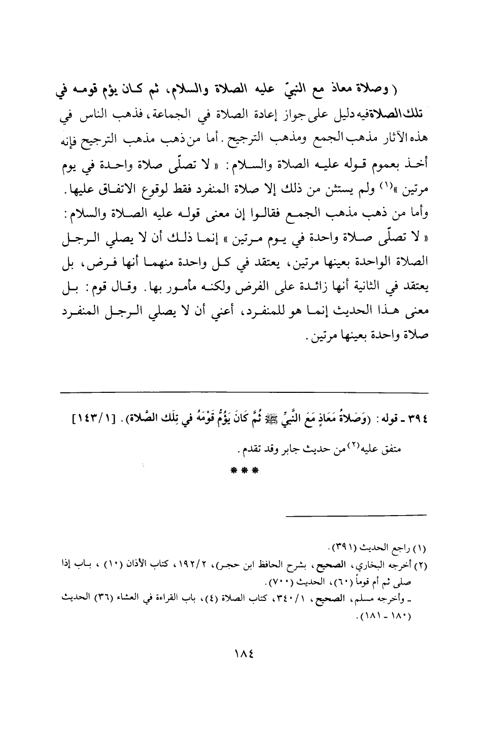 394 - قوله: (وَصَلاةُ مَعَاذٍ مَعَ النَّبيِّ - صلى الله عليه وسلم - ثُمَّ كَانَ يَؤُمُّ قَوْمَهُ في تِلَك الصَّلاة).