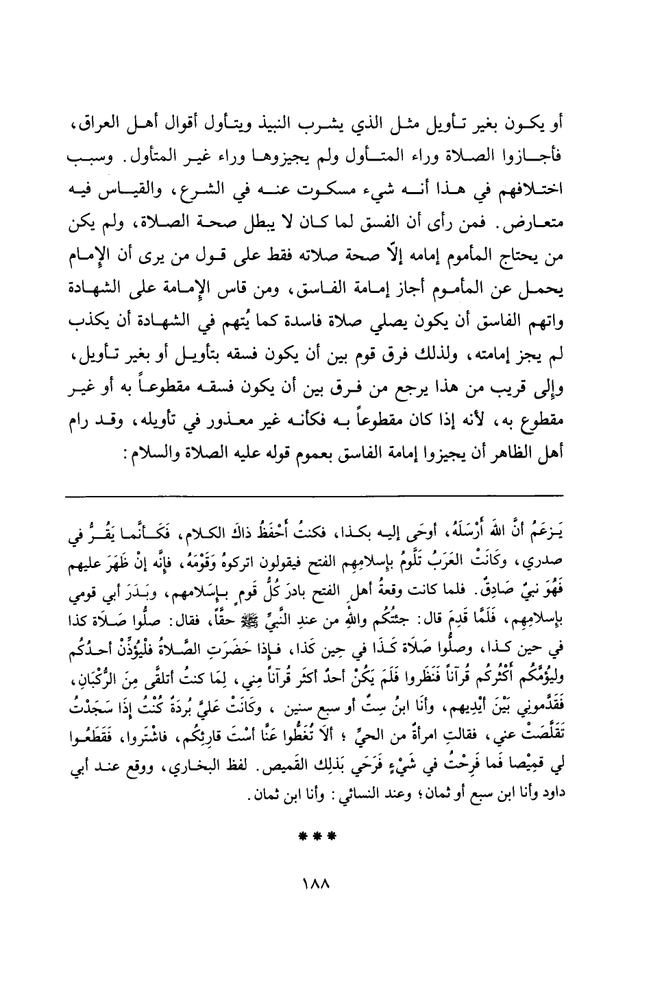 يَزعَمُ أنَّ اللهَ أرْسَلَهُ، أوحَى إليه بكذا، فكنتُ أحْفَظُ ذاكَ الكلام، فَكَأنَّما يَقُرُّ في صدري، وكَانَتْ العَرَبُ تلَّومُ بإِسلامِهِم الفتح فيقولون اتركوهُ وَقَوْمَهُ، فإنَّه إنْ ظَهَرَ عليهم فَهوَ نبيٌ صَادِقٌ. فلما كانت وقعةُ أهلِ الفتح بادرَ كُلُّ قَومٍ بإِسَلامهم، وبَدَرَ أبي قومي بإِسلامِهِم، فَلَمَّا قَدِم قال: جئتُكُم واللهِ من عندِ النَّبيِّ - صلى الله عليه وسلم - حقًّا، فقال: صلُّوا صَلَاة كذا في حين كذا، وصلُّوا صَلَاة كَذَا في حِين كَذا، فإذا حَضَرَتِ الصَّلاةُ فلْيُؤذِّنْ أحدُكُم وليؤُمَّكُم أكْثُركُم قرآنًا فَنَظَروا فَلَمَ يَكُنْ أحدٌ أكثَر قرآنًا مِني، لِمَا كنتُ أتلقَى مِنَ الرُّكْبَانِ، فَقَدَّموني بَيْنَ أيْدِيهم، وأنَا ابنُ سِتٌ أو سبع سنين، وكَانَتْ عَليَّ بُردَةٌ كُنْتُ إذَا سَجَدْتُ تقَلَّصَتْ عني، فقالتِ امرأةٌ من الحيِّ؛ ألَا تُغَطُّوا عَنَّا أسْتَ قارِئِكُم، فاشْتَروا، فَقَطَعُوا لي قمِيْصا فَما فَرِحْتُ فىِ شَيْءٍ فَرَحَي بَذلِك القَميص. لفظ البخاري، ووقع عند أبي داود وأنا ابن سبع أو ثمان؛ وعند النسائي: وأنا ابن ثمان.