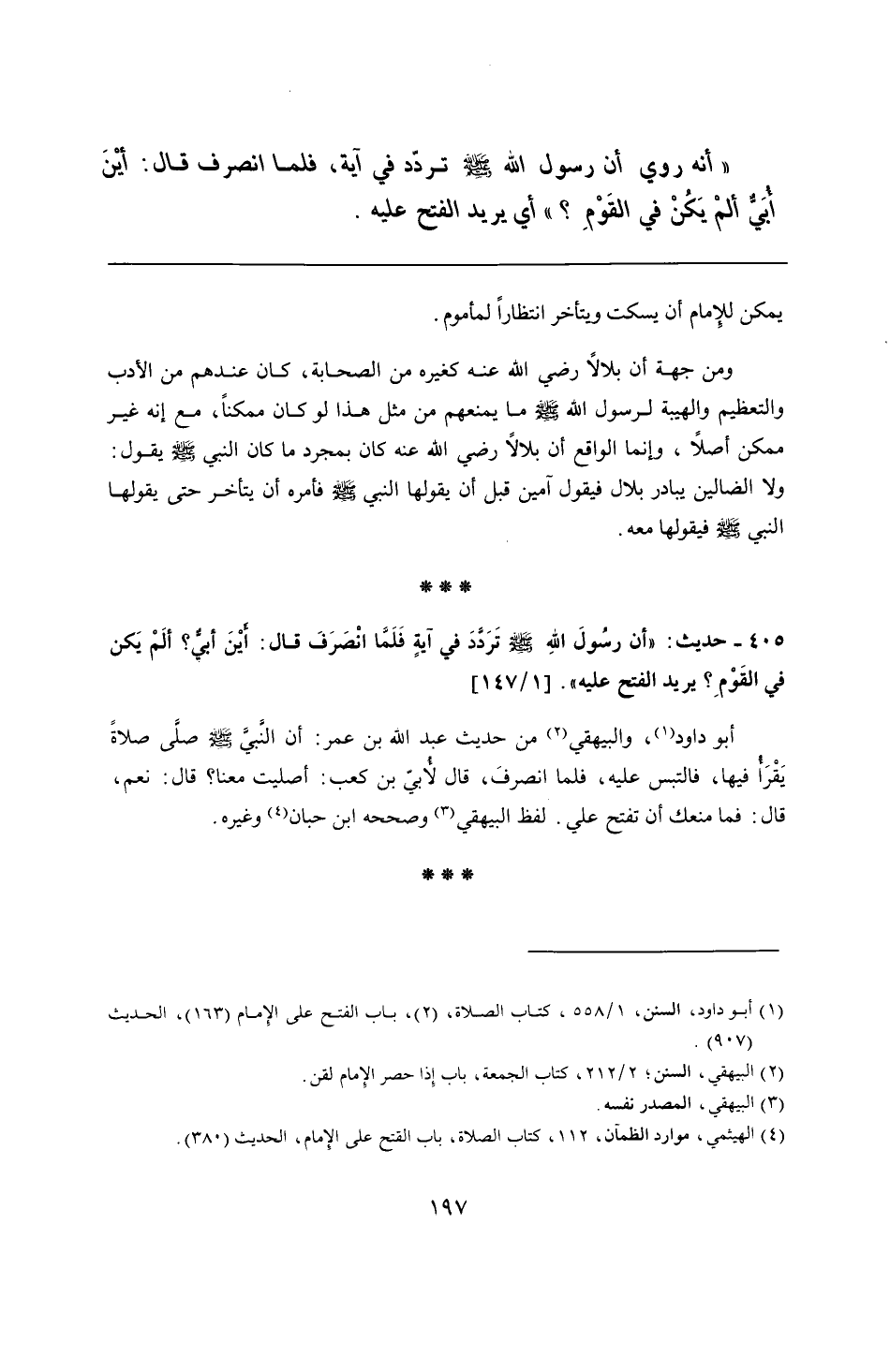 405 - حديث: "أن رسُولَ اللهِ - صلى الله عليه وسلم - تَرَدَّد في آيةٍ فَلَمَّا انْصَرَفَ قال: أيْنَ أبيٌّ؟ ألَمْ يَكن في القَوْمِ؟ يريد الفتح عليه".