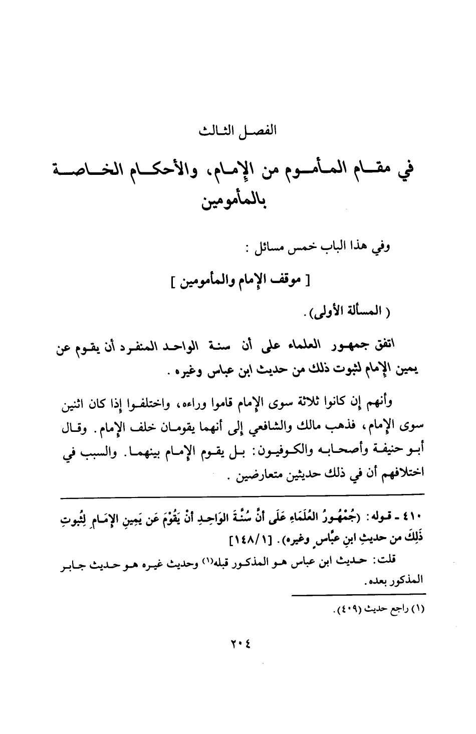 410 - قوله: (جُمْهُورُ العُلَمَاءِ عَلَى أنَّ سُنَّةَ الوَاحِدِ أنْ يَقُوْمَ عَن يَمِينِ الإمَامِ لِثُبوتِ ذَلِكَ من حديثِ ابنِ عبَّاسٍ وغيره).