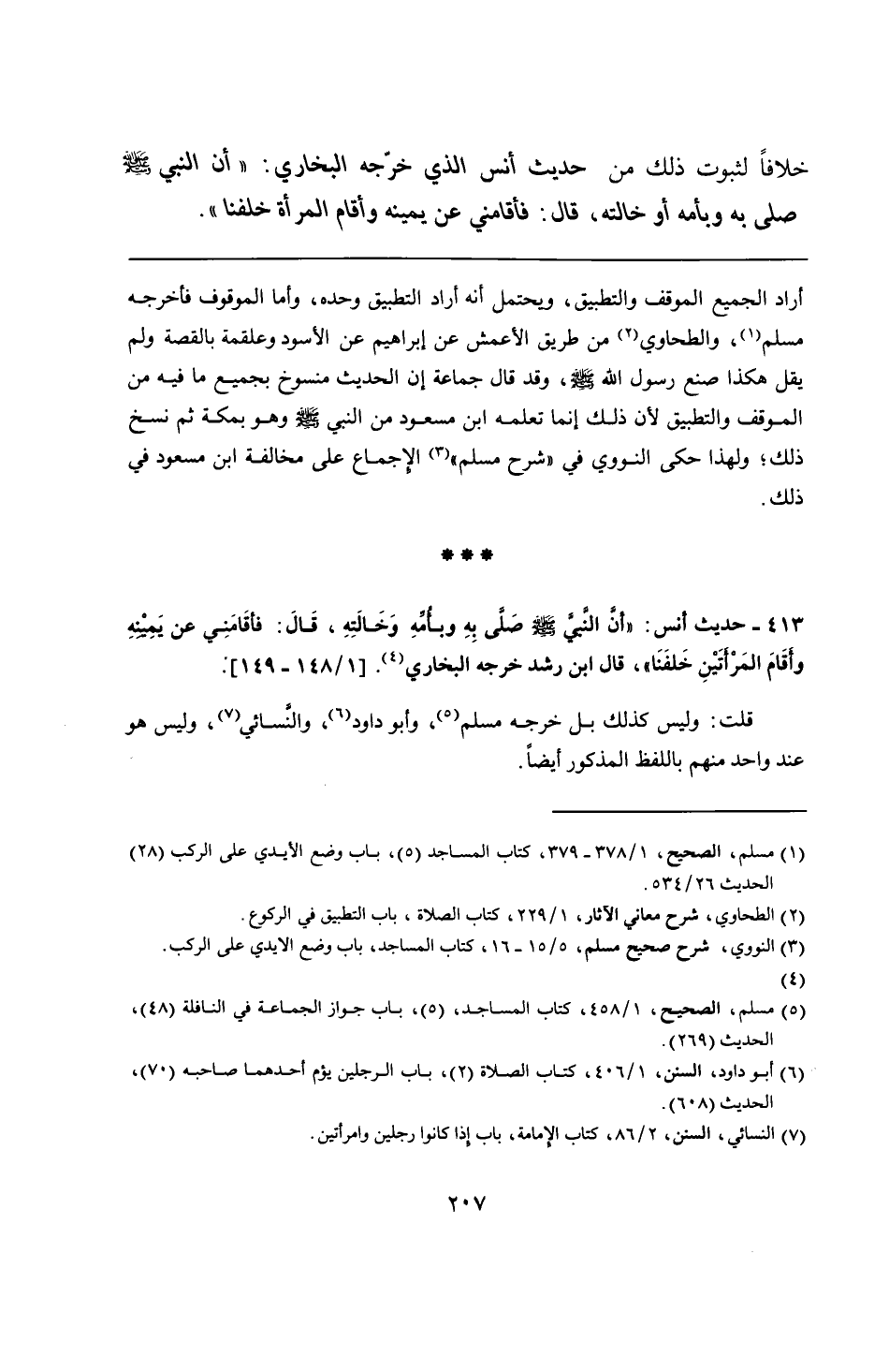 413 - حديث أنس: "أن النَّبيِّ - صلى الله عليه وسلم - صلَّى به وبأُمِّهِ وَخَالَتِهِ، قَالَ: فأقَامَنِي عن يَمِيْنِهِ وأقَامَ المَرْأتَيْنِ خَلفَنَا"، قال ابن رشد خرجه البخاري.