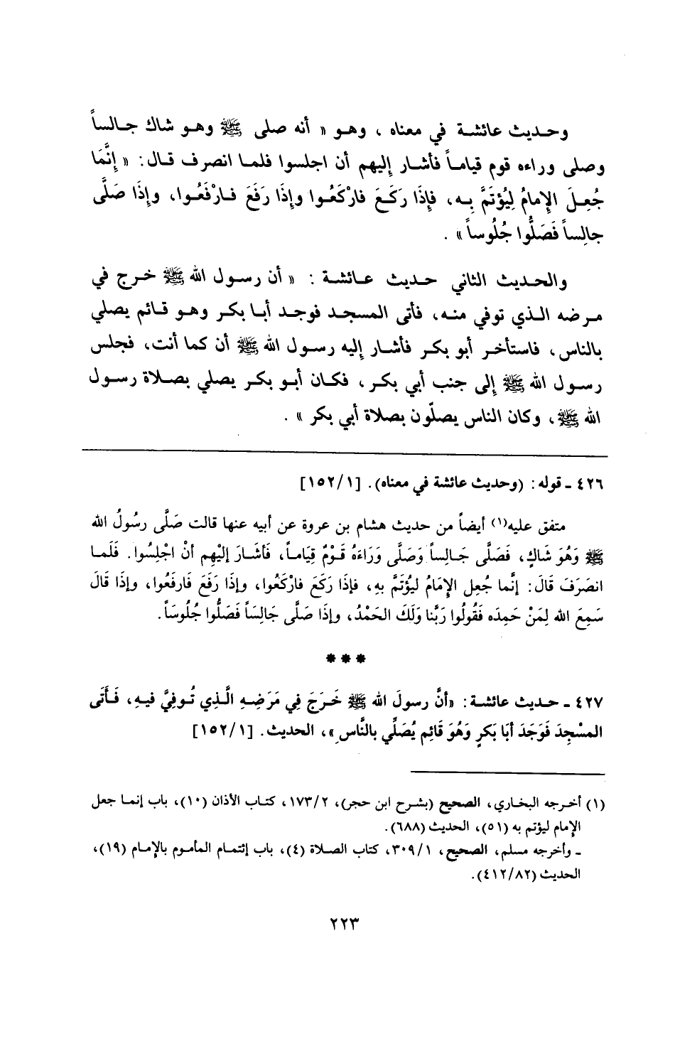 427 - حديث عائشة: "أنَّ رسولَ الله - صلى الله عليه وسلم - خَرَجَ فِي مَرَضِهِ الَّذِي تُوفِيَّ فيهِ، فَأَتَى المسْجِدَ فَوَجَدَ أبَا بَكرٍ وَهُوَ قَائِم يُصَلِّي بالنَّاسِ"، الحديث.