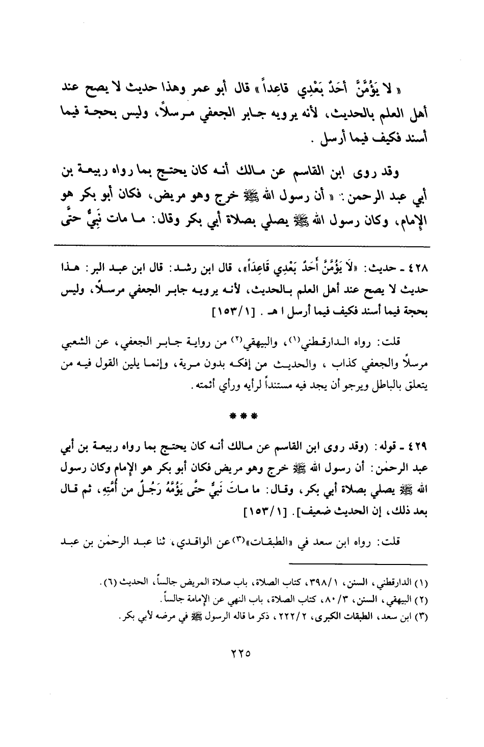 428 - حديث: "لَا يَؤُمَّنَّ أحَدٌ بَعْدِي قَاعِدًا"، قال ابن رشد: قال ابن عبد البر: هذا حديث لا يصح عند أهل العلم بالحديث، لأنه يرويه جابر الجعفي مرسلًا، وليس بحجة فيما أسند فكيف فيما أرسل اهـ.