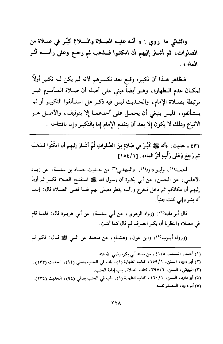 431 - حديث: "أنه - صلى الله عليه وسلم - كَبَّرَ في صَلاةٍ مِنَ الصَّلواتِ ثُمَّ أشَارَ إليهِم أن امكُثُوا فَذَهَبَ ثم رَجِعَ وَعَلى رَأسِهِ أثرُ الماءِ".