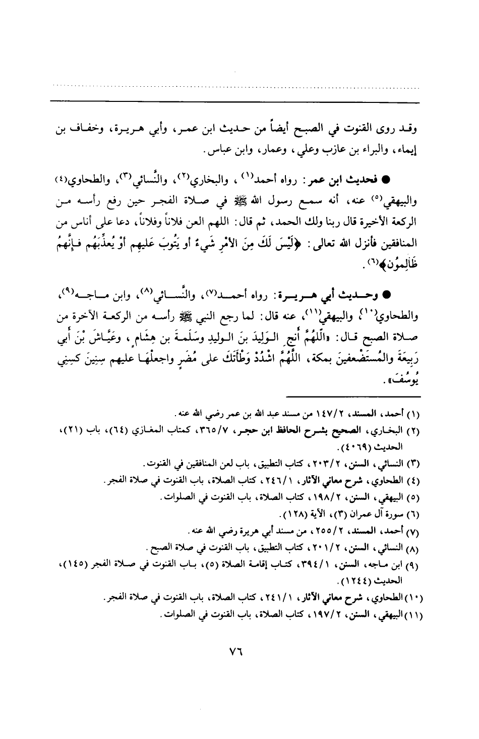 • فحديث ابن عمر: رواه أحمد، والبخاري، والنسائي، والطحاوي والبيهقي عنه، أنه سمع رسول الله - صلى الله عليه وسلم - في صلاة الفجر حين رفع رأسه من الركعة الأخيرة قال ربنا ولك الحمد، ثم قال: اللهم العن فلانًا وفلانًا، دعا على أناس من المنافقين فأنزل الله تعالى: {لَيْسَ لَكَ مِنَ الْأَمْرِ شَيْءٌ أَوْ يَتُوبَ عَلَيْهِمْ أَوْ يُعَذِّبَهُمْ فَإِنَّهُمْ ظَالِمُونَ}.