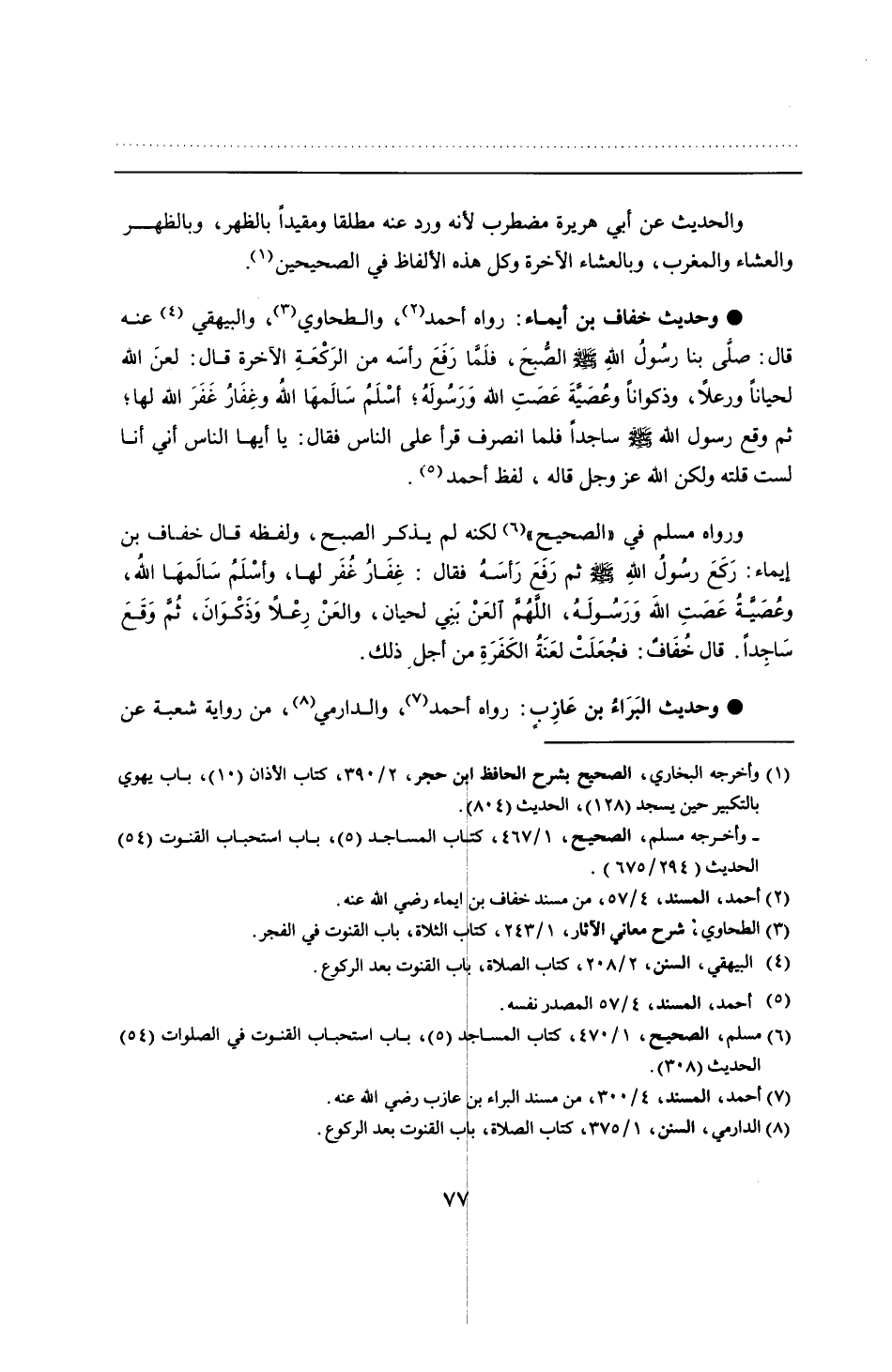 • وحديث خفاف بن أيماء: رواه أحمد، والطحاوي، والبيهقي عنه قال: صلَّى بنا رسُولُ اللهِ - صلى الله عليه وسلم - الصُّبحَ، فلَمَّا رَفَعَ رأَسَه من الرَكْعَةِ الآخرة قال: لعنَ الله لحيانًا ورعلًا، وذكوانًا وعُصَيَّةَ عَصَتِ الله وَرَسُولَهُ؛ أسْلَمُ سَالَمهَا الله وغِفَارُ غَفَرَ الله لها؛ ثم وقع رسول الله - صلى الله عليه وسلم - ساجدًا فلما انصرف قرأ على الناس فقال: يا أيها الناس أني أنا لست قلته ولكن الله -عز وجل- قاله، لفظ أحمد.