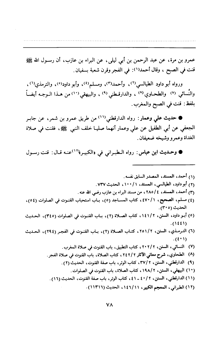 ورواه أبو داود الطيالسي، وأحمد، ومسلم، وأبو داود، والترمذي، والنَّسائي والطحاوي، والدارقطني، والبيهقي من هذا الوجه أيضًا بلفظ: قنت في الصبح والمغرب.