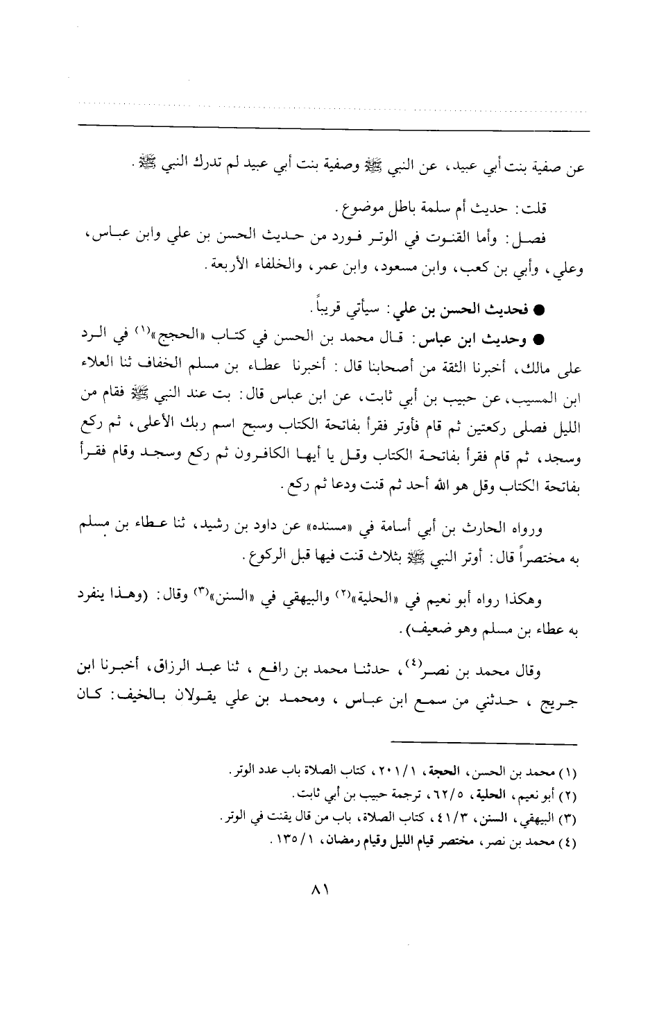 • وحديث ابن عباس: قال محمد بن الحسن في كتاب "الحجج" في الرد على مالك، أخبرنا الثقة من أصحابنا قال: أخبرنا عطاء بن مسلم الخفاف ثنا العلاء بن المسيب، عن حبيب بن أبي ثابت، عن ابن عباس قال: بت عند النبي - صلى الله عليه وسلم - فقام من الليل فصلى ركعتين ثم قام فأوتر فقرأ بفاتحة الكتاب وسبح اسم ربك الأعلى، ثم ركع وسجد، ثم قام فقرأ بفاتحة الكتاب وقل يا أيها الكافرون ثم ركع وسجد وقام فقرأ بفاتحة الكتاب وقل هو الله أحد ثم قنت ودعا ثم ركع.