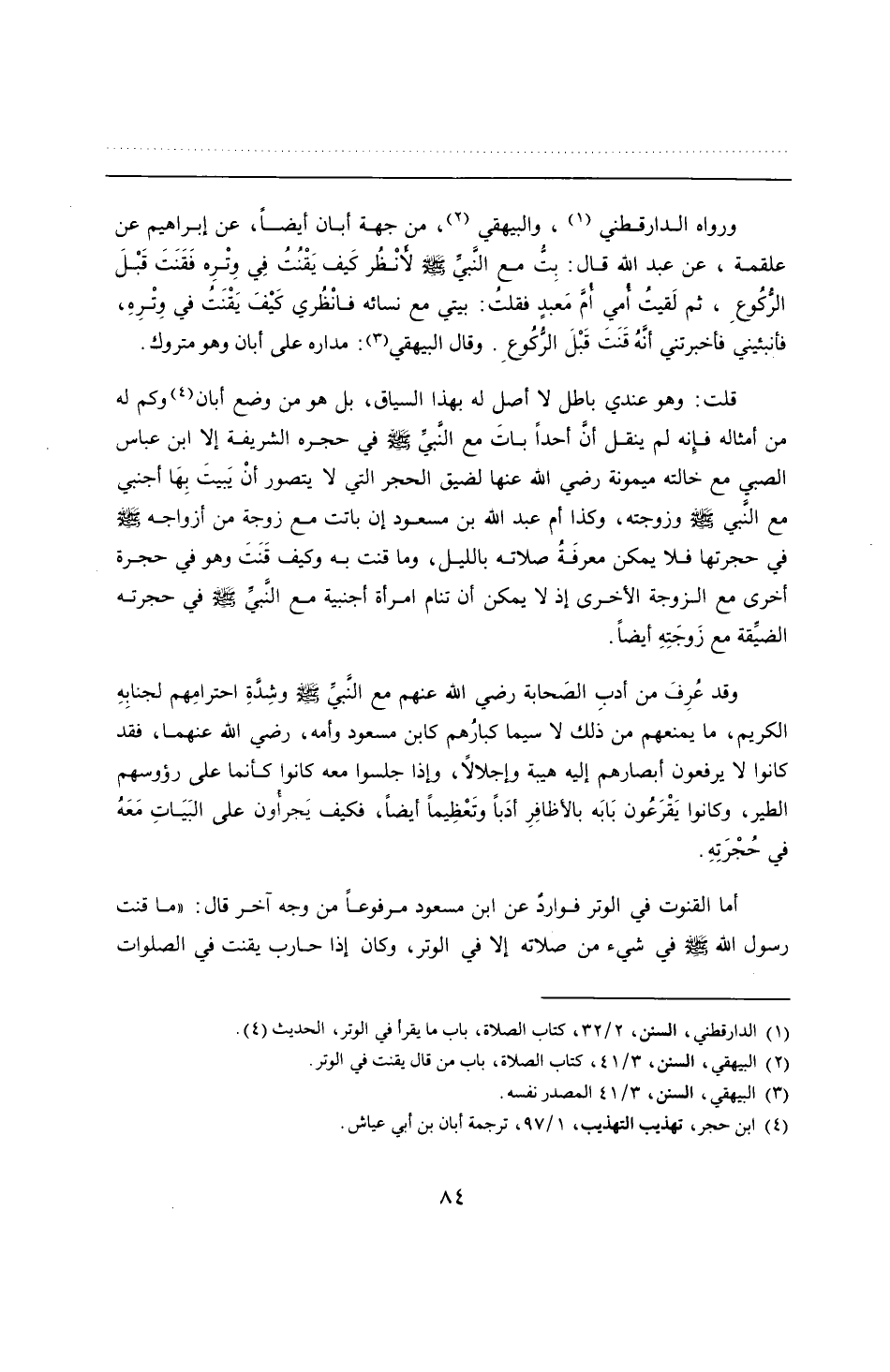 ورواه الدارقطني، والبيهقي، من جهة أبان أيضًا، عن إبراهيم عن علقمة، عن عبد الله قال: بِتُّ مع النَّبيِّ - صلى الله عليه وسلم - لأنْظُر كَيف يَقْنُتُ فِي وِتْرِه فَقَنَتَ قَبْلَ الرُّكُوعِ، ثم لَقيتُ أُمي أُمَّ مَعبدٍ فقلتُ: بيتي مع نسائه فانْظُري كَيْفَ يَقْنَتُ في وِتْرِهِ، فأنبئيني فأخبرتني أنَّهُ قَنَتَ قَبْلَ الرُّكُوعِ. وقال البيهقي: مداره على أبان وهو متروك.