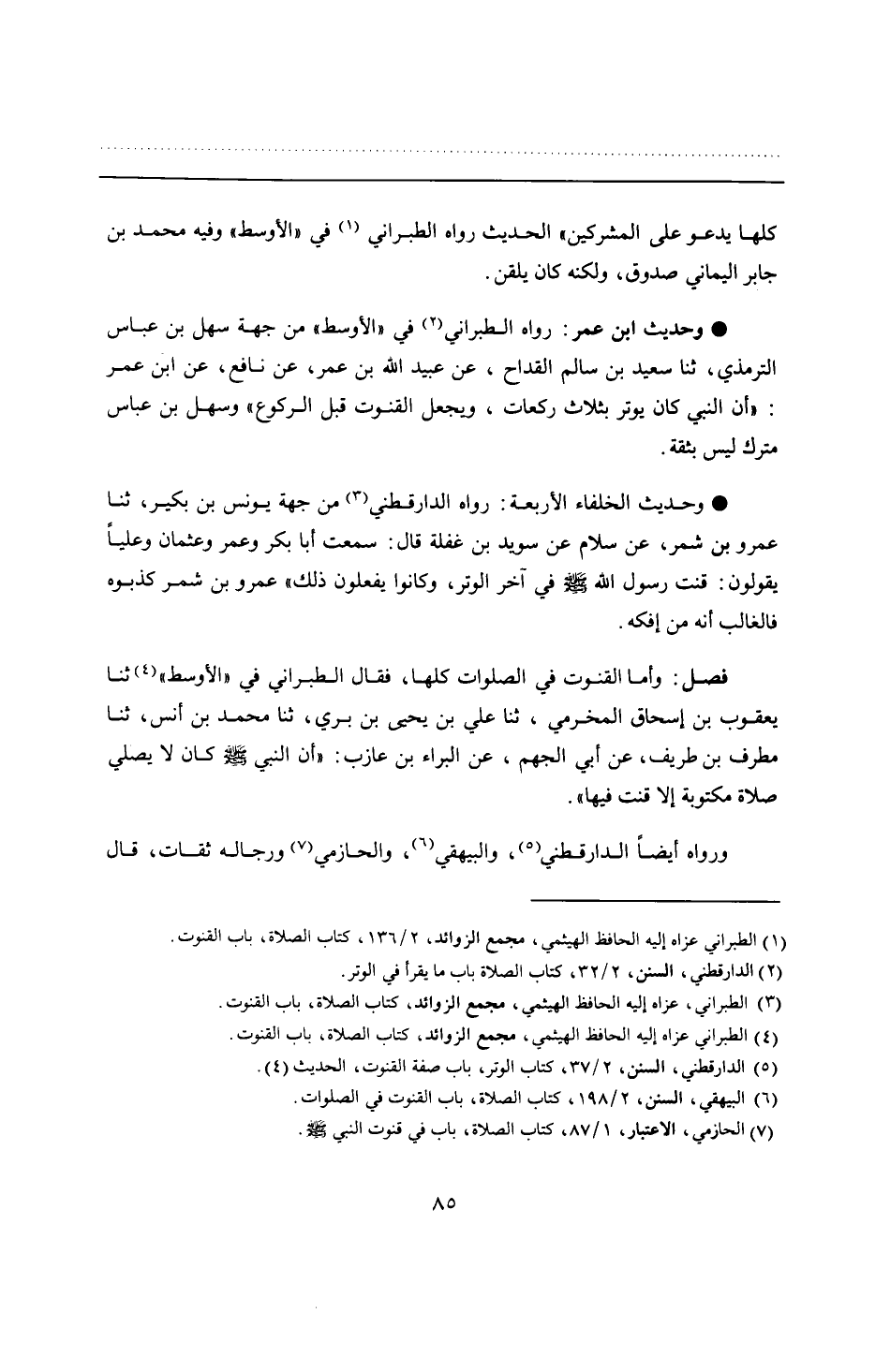 • وحديث ابن عمر: رواه الطبراني في "الأوسط" من جهة سهل بن عباس الترمذي، ثنا سعيد بن سالم القداح، عن عبيد الله بن عمر، عن نافع، عن ابن عمر: "أن النبي كان يوتر بثلاث ركعات، ويجعل القنوت قبل الركوع" وسهل بن عباس مترك ليس بثقة.