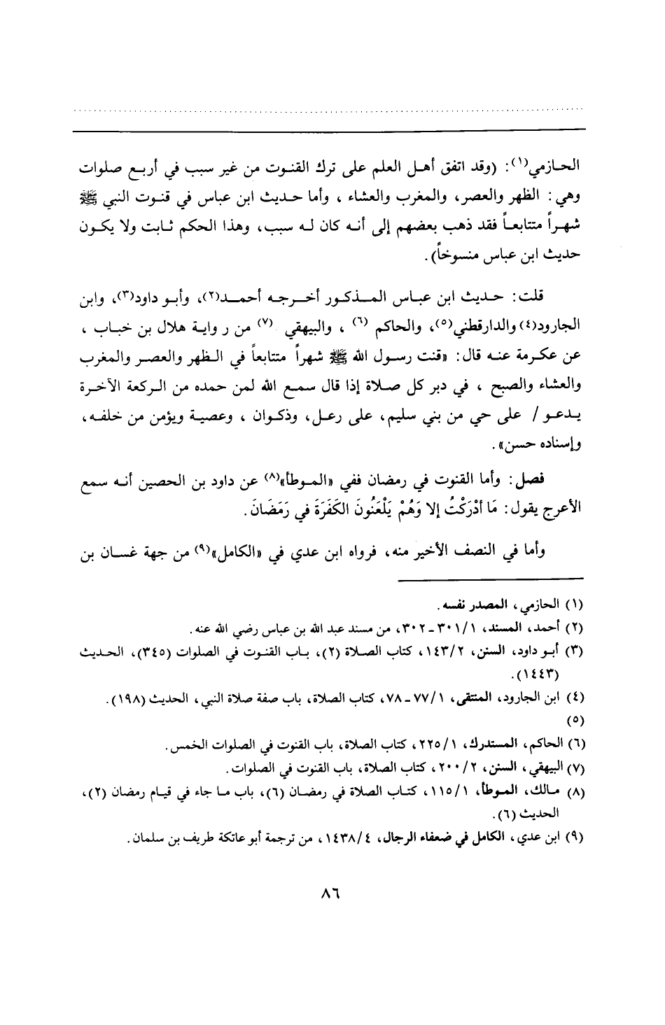 الحازمي: (وقد اتفق أهل العلم على ترك القنوت من غير سبب في أربع صلوات وهي: الظهر والعصر، والمغرب والعشاء، وأما حديث ابن عباس في قنوت النبي - صلى الله عليه وسلم - شهرًا متتابعًا فقد ذهب بعضهم إلى أنه كان له سبب، وهذا الحكم ثابت ولا يكون حديث ابن عباس منسوخًا).