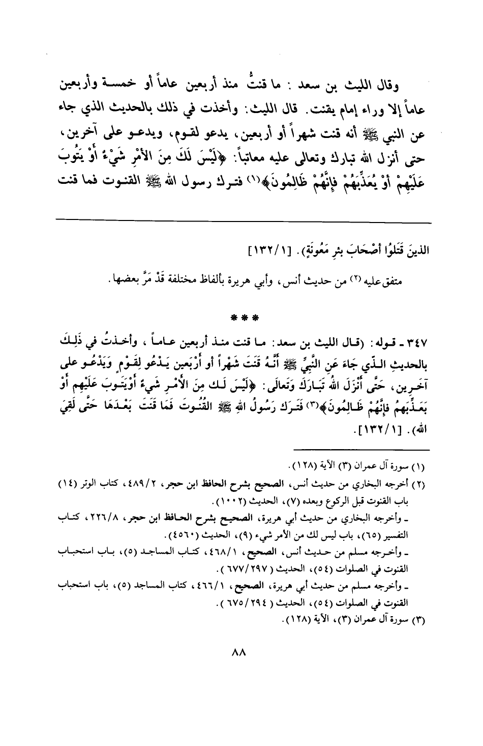 347 - قوله: (قال الليث بن سعد: ما قنت منذ أربعين عامًا، وأخذتُ في ذَلِكَ بالحديثِ الذّي جَاءَ عَنِ النَّبِيِّ - صلى الله عليه وسلم - أَنَّهُ قَنَتَ شَهْرًا أو أَرْبَعين يَدْعُو لِقَوْم وَيَدْعُو على آخَرين، حَتَّى أَنْزَلَ اللهُ تَبَارَكَ وَتَعالَى: {لَيْسَ لَكَ مِنَ الْأَمْرِ شَيْءٌ أَوْ يَتُوبَ عَلَيْهِمْ أَوْ يُعَذِّبَهُمْ فَإِنَّهُمْ ظَالِمُونَ} فَتَرَك رَسُولُ اللهِ - صلى الله عليه وسلم - القُنُوتَ فَمَا قَنَتَ بَعْدَهَا حَتَى لَقِيَ الله).