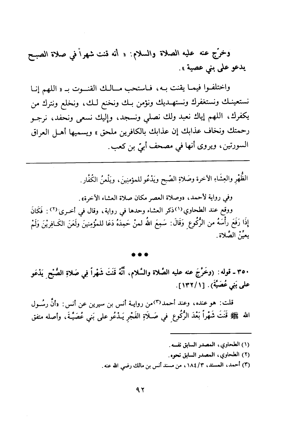 350 - قوله: (وخَرَّجَ عنه -عليه الصَّلاة والسلام-، أَنَّهُ قَنَتَ شَهْرًا فِي صَلاةِ الصُّبْحِ يَدْعَو على بَنِي عُصَيَّةَ).