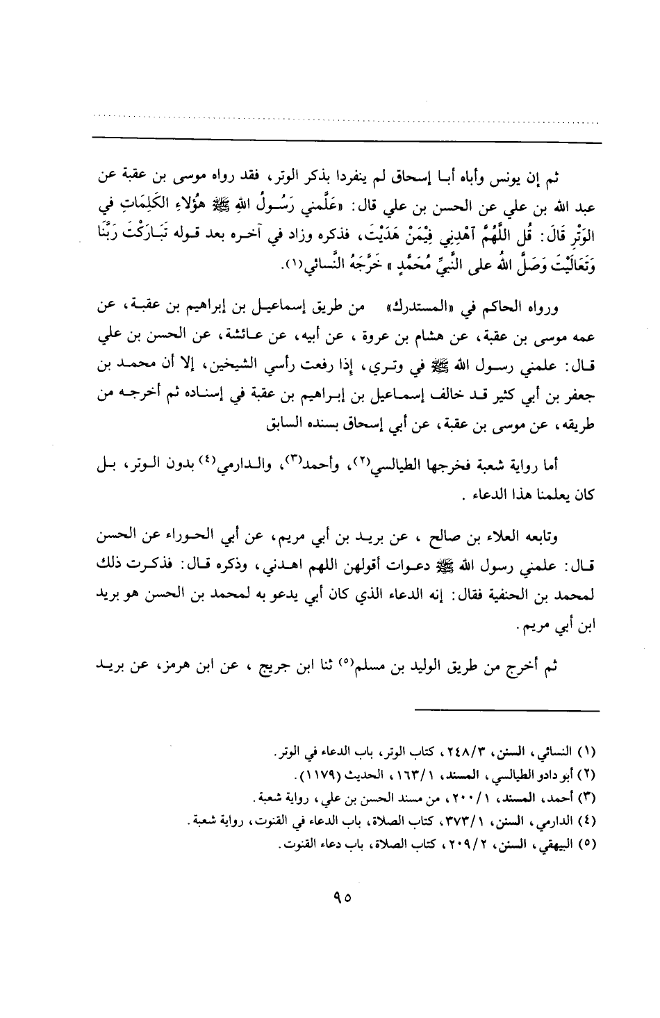 ثم إن يونس وأباه أبا إسحاق لم ينفردا بذكر الوتر، فقد رواه موسى بن عقبة عن عبد الله بن علي عن الحسن بن علي قال: "عَلَّمني رَسُولُ اللهِ - صلى الله عليه وسلم - هُؤلاءِ الكَلِمَاتِ في الوَتْرِ قَالَ: قُل اللَّهُمَّ اهْدِنِي فِيْمَنْ هَدَيْتَ، فذكره وزاد في آخره بعد قوله تَبَارَكْتَ رَبَّنَا وَتَعَالَيْتَ وَصَلَّ اللهُ على النَّبِيِّ مُحَمدٍ" خَرَّجَهُ النَّسائي.