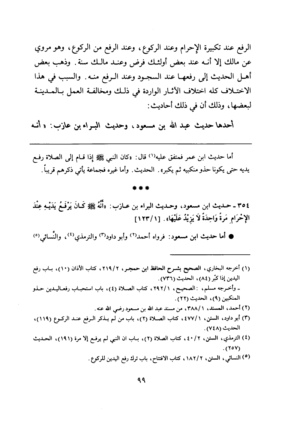 354 - حديث ابن مسعود، وحديث البراء بن عازب: "أنَّهُ - صلى الله عليه وسلم - كَانَ يَرْفَعُ يَدَيْهِ عِنْدَ الإِحْرَامِ مَرةً وَاحِدَةً لاَ يَزِيْدُ عَلَيْهَا".