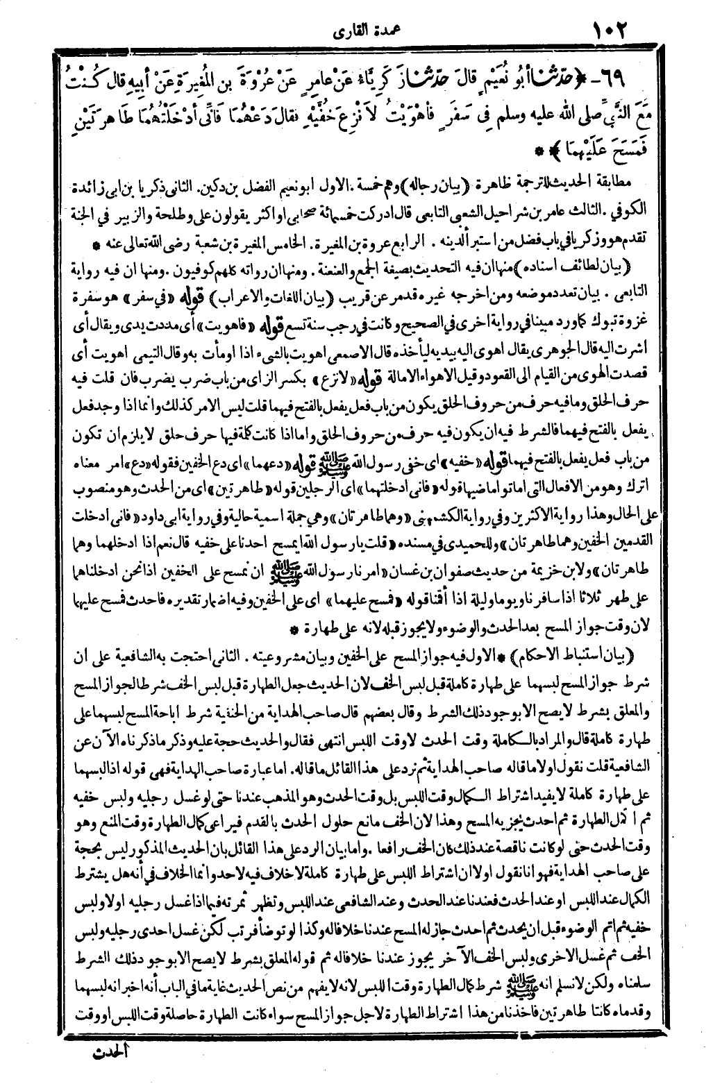 بَيَان اللُّغَات وَالْإِعْرَاب قَوْله: (فِي سفر) : هُوَ سفرة غَزْوَة تَبُوك كَمَا ورد مُبينًا فِي رِوَايَة أُخْرَى فِي (الصَّحِيح) وَكَانَت فِي رَجَب سنة تسع. قَوْله: (فَأَهْوَيْت) أَي: مددت يَدي، وَيُقَال: أَي أَشرت إِلَيْهِ. قَالَ الْجَوْهَرِي: يُقَال أَهْوى إِلَيْهِ بيدَيْهِ ليأخذه. قَالَ الْأَصْمَعِي: اهويت الشَّيْء إِذا أَوْمَأت بِهِ. وَقَالَ التَّيْمِيّ: أهويت أَي: قصدت الْهوى من الْقيام إِلَى الْقعُود. وَقيل: الإهواء: الإمالة. قَوْله: (لأنزع) ، بِكَسْر الزَّاي من بَاب: ضرب يضْرب، فَإِن قلت: فِيهِ حرف الْحلق، وَمَا فِيهِ حرف من حُرُوف الْحلق، يكون من بَاب: فعل يفعل بِالْفَتْح، فيهمَا. قلت: لَيْسَ الْأَمر كَذَلِك، وَإِنَّمَا إِذا وجد فعل يفعل بِالْفَتْح فيهمَا، فَالشَّرْط فِيهِ أَن يكون فِيهِ حرف من حُرُوف الْحلق، وَأما إِذا كَانَت كلمة فِيهَا حرف حلق لَا يلْزم أَن تكون من بَاب فعل يفعل بِالْفَتْح فيهمَا. قَوْله: (خُفْيَة) أَي: خَفِي رَسُول الله صلى الله عَلَيْهِ وَسلم. قَوْله: (دعهما) اي: دع الْخُفَّيْنِ. فَقَوله: (دع) أَمر مَعْنَاهُ: أترك، وَهُوَ من الْأَفْعَال الَّتِي أماتوا ماضيها. قَوْله: (فَإِنِّي أدخلتهما) أَي: الرجلَيْن. قَوْله: (طاهرتين) أَي من الْحَدث، وَهُوَ مَنْصُوب على الْحَال، وَهَذَا رِوَايَة الْأَكْثَرين. وَفِي رِوَايَة الْكشميهني: (وهما طاهرتان) ، وَهِي جملَة أسمية حَالية. وَفِي رِوَايَة أبي دَاوُد: (فَإِنِّي أدخلت الْقَدَمَيْنِ الْخُفَّيْنِ وهما طاهرتان) . وللحميدي فِي (مُسْنده) : (قلت يَا رَسُول الله: أيمسح أَحَدنَا على خفيه؟ قَالَ: نعم، إِذا أدخلهما وهما طاهرتان) . وَلابْن خُزَيْمَة من حَدِيث صَفْوَان بن غَسَّان: (أمرنَا رَسُول الله صلى الله عَلَيْهِ وَسلم أَن نمسح على الْخُفَّيْنِ إِذا نَحن أدخلناهما على طهر ثَلَاثًا إِذا سافرنا، وَيَوْما وَلَيْلَة إِذا أَقَمْنَا) . قَوْله: (فَمسح عَلَيْهِمَا) أَي: على الْخُفَّيْنِ، وَفِيه إِضْمَار تَقْدِيره: فأحدث فَمسح عَلَيْهِمَا، لِأَن وَقت جَوَاز الْمسْح بعد الْحَدث. وَالْوُضُوء، وَلَا يجوز قبله، لِأَنَّهُ على طَهَارَة.