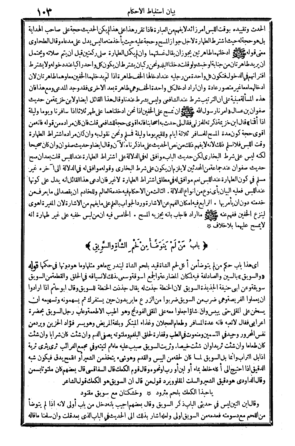 الْحَدث، وتقييده بِوَقْت اللّبْس أَمر زَائِد لَا يفهم من الْعبارَة. فَإِذا تقرر هَذَا على هَذَا لم يكن الحَدِيث حجَّة على صَاحب (الْهِدَايَة) ، بل هُوَ حجَّة لَهُ، حَيْثُ اشْترط الطَّهَارَة لأجل جَوَاز الْمسْح، وَحجَّة عَلَيْهِ حَيْثُ يَأْخُذ مِنْهُ مَا لَيْسَ يدل على مدعاه. وَقَالَ الطَّحَاوِيّ: معنى قَوْله صلى الله عَلَيْهِ وَسلم: أدخلتهما طاهرتين، يجوز أَن يُقَال: غسلتهما، وَإِن لم يكمل الطَّهَارَة صلى رَكْعَتَيْنِ قبل أَن يتم صلَاته، وَيحْتَمل أَن يُرِيد: طاهرتان من جَنَابَة أَو خبث. وَلَو قلت: دَخَلنَا الْبَلَد وَنحن ركبان، يشْتَرط أَن يكون كل وَاحِد رَاكِبًا عِنْد دُخُوله، وَلَا يشْتَرط افترانهم فِي الدُّخُول، فَتكون كل وَاحِدَة من رجلَيْهِ عِنْد إدخالها الْخُف طَاهِرَة إِذا لم يدخلهما الْخُفَّيْنِ مَعًا، وهما طاهرتان، لِأَن إدخالهما مَعًا غير مُتَصَوّر عَادَة، وَإِن أَرَادَ إِدْخَال كل وَاحِدَة الْخُف وَهِي طَاهِرَة بعد الْأُخْرَى فقد وجد الْمُدَّعِي، وَمَعَ هَذَا فَإِن هَذِه الْمَسْأَلَة مَبْنِيَّة على أَن التَّرْتِيب شَرط عِنْد الشَّافِعِي وَلَيْسَ بِشَرْط عندنَا، وَقَالَ: هَذَا الْقَائِل أَيْضا: وَلابْن خُزَيْمَة، من حَدِيث صَفْوَان بن عَسَّال: (أمرنَا رَسُول الله صلى الله عَلَيْهِ وَسلم أَن نمسح على الْخُفَّيْنِ إِذا نَحن أدخلناهما على طهر ثَلَاثًا إِذا سافرنا، وَيَوْما وَلَيْلَة إِذا أَقَمْنَا) . قَالَ ابْن خُزَيْمَة: ذكرته للمزني فَقَالَ لي: حدث بِهِ أَصْحَابنَا، فَإِنَّهُ أقوى حجَّة للشَّافِعِيّ. قلت: فَإِن كَانَ مُرَاده من قَوْله: فَإِنَّهُ من أقوى حجَّة، كَون مُدَّة الْمسْح للْمُسَافِر ثَلَاثَة أَيَّام وللمقيم يَوْمًا وَلَيْلَة، فَمُسلم. وَنحن نقُول بِهِ، وَإِن كَانَ مُرَاده اشْتِرَاط الطَّهَارَة وَقت اللّبْس فَلَا نسلم ذَلِك، لِأَنَّهُ لَا يفهم ذَلِك من نَص الحَدِيث على مَا ذَكرْنَاهُ الْآن. وَقَالَ أَيْضا: وَحَدِيث صَفْوَان، وَإِن كَانَ صَحِيحا، لكنه لَيْسَ على شَرط البُخَارِيّ، لَكِن حَدِيث الْبَاب مُوَافق لَهُ فِي الدّلَالَة على اشْتِرَاط الطَّهَارَة عِنْد اللّبْس. قلت: بعد أَن صَحَّ حَدِيث صَفْوَان عِنْد جمَاعَة من الْمُحدثين لَا يلْزم أَن يكون على شَرط البُخَارِيّ. وَقَوله: مُوَافق لَهُ فِي الدّلَالَة. إِلَى آخِره، غير مُسلم فِي كَون الطَّهَارَة عِنْد اللّبْس. نعم، مُوَافق لَهُ فِي مُطلق اشْتِرَاط الطَّهَارَة لَا غير، فَإِن ادّعى هَذَا الْقَائِل أَنه يدل على كَونهَا عِنْد اللّبْس، فَعَلَيهِ الْبَيَان بِأَيّ نوع من أَنْوَاع الدّلَالَة. الثَّالِث: من الْأَحْكَام، فِيهِ: خدمَة الْعَالم، وللخادم أَن يقْصد إِلَى مَا يعرف من خدمته دون أَن يَأْمر بهَا. الرَّابِع: فِيهِ إِمْكَان الْفَهم عَن الْإِشَارَة ورد الْجَواب بِالْعلمِ على مَا يفهم من الْإِشَارَة، لِأَن الْمُغيرَة أَهْوى لينزع الْخُفَّيْنِ، ففهم عَنهُ صلى الله عَلَيْهِ وَسلم مَا أَرَادَ، فَأجَاب بِأَنَّهُ يجْزِيه الْمسْح. الْخَامِس: فِيهِ: أَن من لبس خفيه على غير طَهَارَة انه لَا يمسح عَلَيْهِمَا بِلَا خلاف.