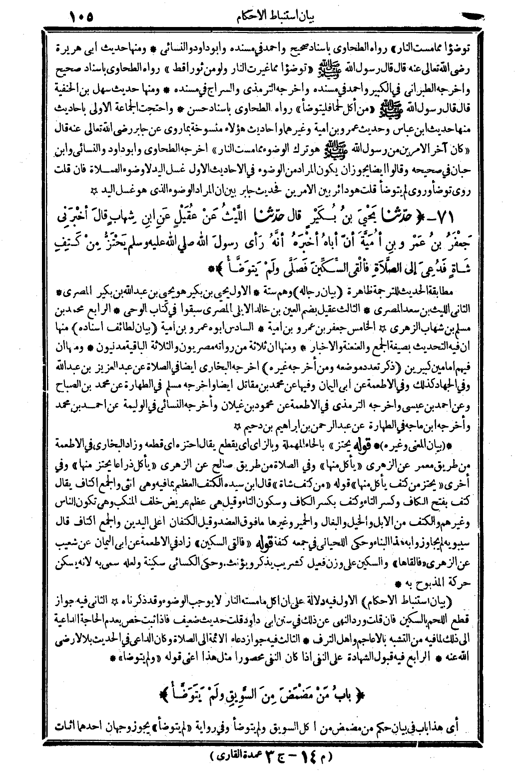 توضؤا مِمَّا مست النَّار " رَوَاهُ الطَّحَاوِيّ بِإِسْنَاد صَحِيح وَأحمد فِي مُسْنده وَأَبُو دَاوُد وَالنَّسَائِيّ وَمِنْهَا حَدِيث أبي هُرَيْرَة رَضِي الله تَعَالَى عَنهُ قَالَ قَالَ رَسُول الله - صَلَّى اللَّهُ عَلَيْهِ وَسَلَّم َ - " توضؤا مِمَّا غيرت النَّار وَلَو من ثَوْر أقط " رَوَاهُ الطَّحَاوِيّ بِإِسْنَاد صَحِيح وَأخرجه الطَّبَرَانِيّ فِي الْكَبِير وَأحمد فِي مُسْنده وَأخرجه التِّرْمِذِيّ والسراج فِي مُسْنده وَمِنْهَا حَدِيث سهل بن الْحَنَفِيَّة قَالَ قَالَ رَسُول الله - صَلَّى اللَّهُ عَلَيْهِ وَسَلَّم َ - " من أكل لَحْمًا فَليَتَوَضَّأ " رَوَاهُ الطَّحَاوِيّ بِإِسْنَاد حسن واحتجت الْجَمَاعَة الأولى بِأَحَادِيث مِنْهَا حَدِيث ابْن عَبَّاس وَحَدِيث عَمْرو بن أُميَّة وَغَيرهمَا وَأَحَادِيث هَؤُلَاءِ مَنْسُوخَة بِمَا روى عَن جَابر رَضِي الله تَعَالَى عَنهُ قَالَ " كَانَ آخر الْأَمريْنِ من رَسُول الله - صَلَّى اللَّهُ عَلَيْهِ وَسَلَّم َ - هُوَ ترك الْوضُوء مِمَّا مست النَّار " أخرجه الطَّحَاوِيّ وَأَبُو دَاوُد وَالنَّسَائِيّ وَابْن حبَان فِي صَحِيحه وَقَالُوا أَيْضا يجوز أَن يكون المُرَاد من الْوضُوء فِي الْأَحَادِيث الأول غسل الْيَد لَا وضوء الصَّلَاة فَإِن قلت روى تَوَضَّأ وروى وَلم يتَوَضَّأ قلت هُوَ دائر بَين الْأَمريْنِ فَحَدِيث جَابر بَين أَن المُرَاد الْوضُوء الَّذِي هُوَ غسل الْيَد