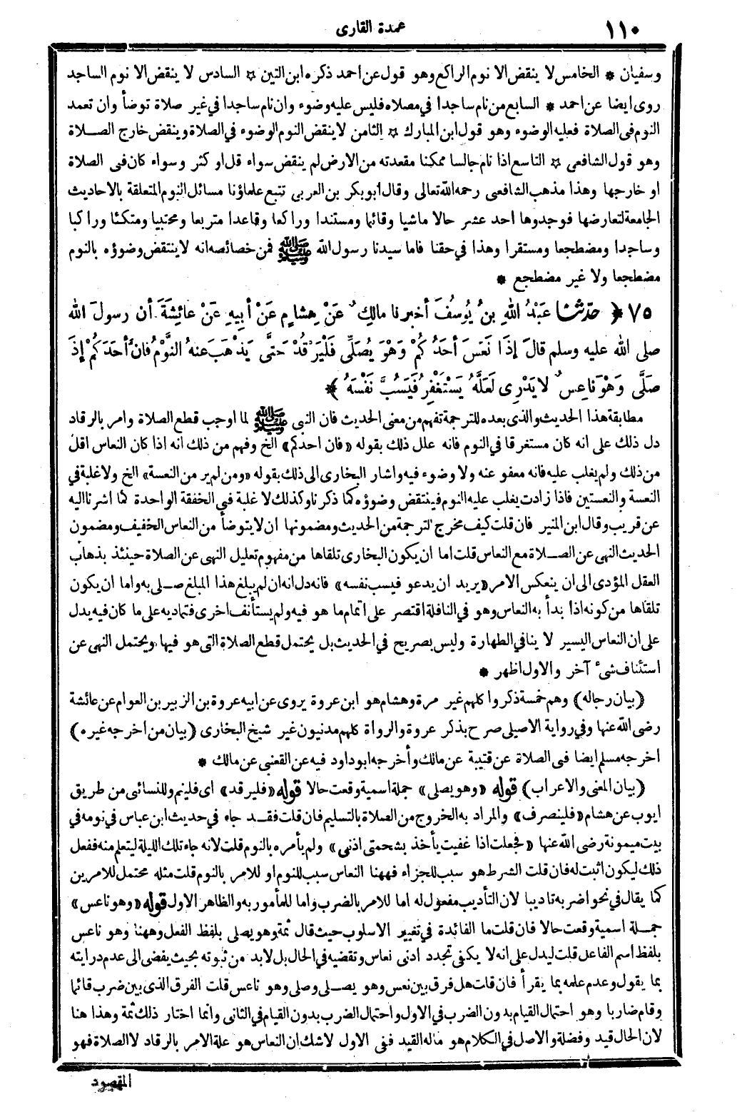 وسُفْيَان. الْخَامِس: لَا يقنقص إلاَّ نوم الرَّاكِع، وَهُوَ قَول عَن أَحْمد ذكره ابْن التِّين. السَّادِس: لَا ينْقض إلاَّ نوم الساجد، رُوِيَ أَيْضا عَن أَحْمد. السَّابِع: من نَام سَاجِدا فِي مُصَلَّاهُ فَلَيْسَ عَلَيْهِ وضوء. وَإِن نَام سَاجِدا فِي غير صَلَاة تَوَضَّأ، وَإِن تعمد النّوم فِي الصَّلَاة فَعَلَيهِ الْوضُوء، وَهُوَ قَول ابْن الْمُبَارك. الثَّامِن: لَا ينْقض النّوم الْوضُوء فِي الصَّلَاة، وينقض خَارج الصَّلَاة، وَهُوَ قَول الشَّافِعِي. التَّاسِع: إِذا نَام جَالِسا مُمكنا مقعدته من الأَرْض لم ينْقض، سَوَاء قل أَو كثر، وَسَوَاء كَانَ فِي الصَّلَاة أَو خَارِجهَا، وَهَذَا مَذْهَب الشَّافِعِي، رَحمَه الله تَعَالَى؛ وَقَالَ أَبُو بكر بن الْعَرَبِيّ: تتبع عُلَمَاؤُنَا مسَائِل النّوم الْمُتَعَلّقَة بالأحاديث الجامعة لتعارضها، فوجدوها أحد عشر حَالا: مَاشِيا، وَقَائِمًا، ومستنداً، وراكعاً، وَقَاعِدا متربعاً، ومحتبياً، ومتكئاً، وراكباً، وساجداً، ومضطجعاً، ومستقراً. وَهَذَا فِي حَقنا، فَأَما سيدنَا رَسُول الله صلى الله عَلَيْهِ وَسلم فَمن خَصَائِصه أَنه لَا ينْتَقض وضوؤه بِالنَّوْمِ، مُضْطَجعا وَلَا غير مُضْطَجع.