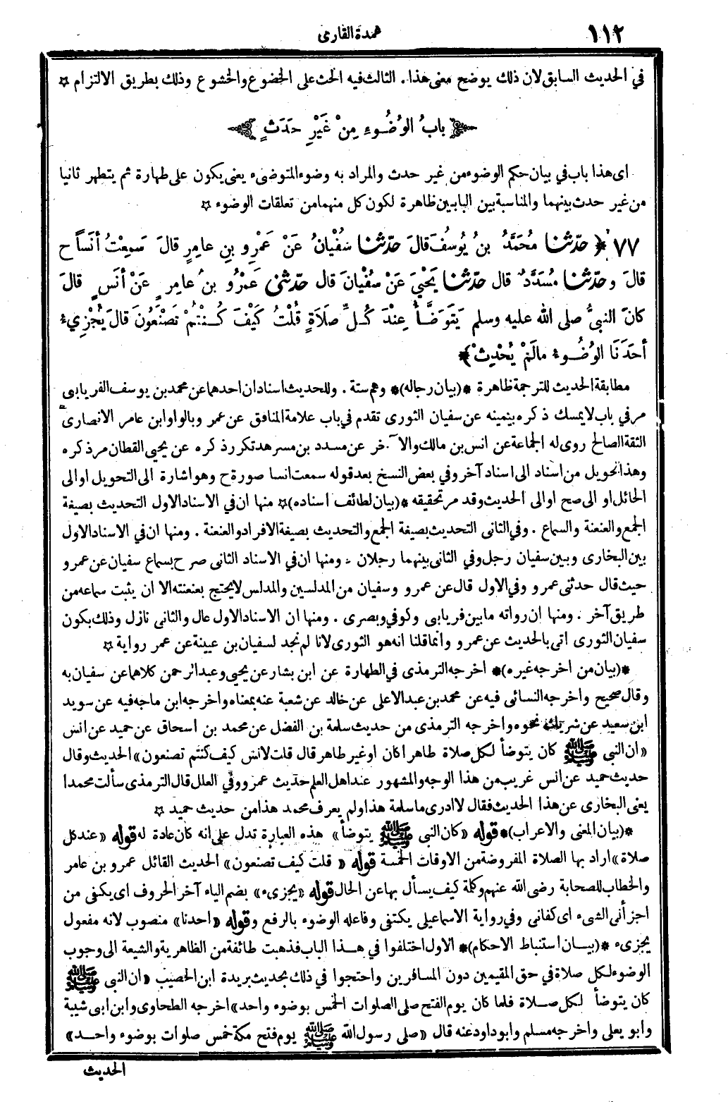 بَيَان من أخرجه غَيره أخرجه التِّرْمِذِيّ فِي الطَّهَارَة عَن ابْن بشار عَن يحيى وَعبد الرَّحْمَن، كِلَاهُمَا عَن سُفْيَان بِهِ، وَقَالَ: صَحِيح. وَأخرجه النَّسَائِيّ فِيهِ عَن مُحَمَّد بن عبد الْأَعْلَى عَن خَالِد عَن شُعْبَة عَنهُ بِمَعْنَاهُ. وَأخرجه ابْن مَاجَه فِيهِ عَن سُوَيْد ابْن سعيد عَن شريك نَحوه. وَأخرجه التِّرْمِذِيّ من حَدِيث سَلمَة بن الْفضل عَن مُحَمَّد بن إِسْحَاق عَن حميد عَن أنس: (ان النَّبِي صلى الله عَلَيْهِ وَسلم كَانَ يتَوَضَّأ بِكُل صَلَاة، طَاهِرا كَانَ أَو غير طَاهِر. قَالَ: قلت لأنس: كَيفَ كُنْتُم تَصْنَعُونَ) ؟ الحَدِيث، وَقَالَ: حَدِيث حميد عَن أنس غَرِيب من هَذَا الْوَجْه، وَالْمَشْهُور عِنْد أهل الْعلم حَدِيث عَمْرو، وَفِي (الْعِلَل) قَالَ التِّرْمِذِيّ: سَأَلت مُحَمَّدًا يَعْنِي البُخَارِيّ عَن هَذَا الحَدِيث فَقَالَ: لَا ادري مَا سَلمَة هَذَا؟ وَلم يعرف مُحَمَّد هَذَا من حَدِيث حميد.
