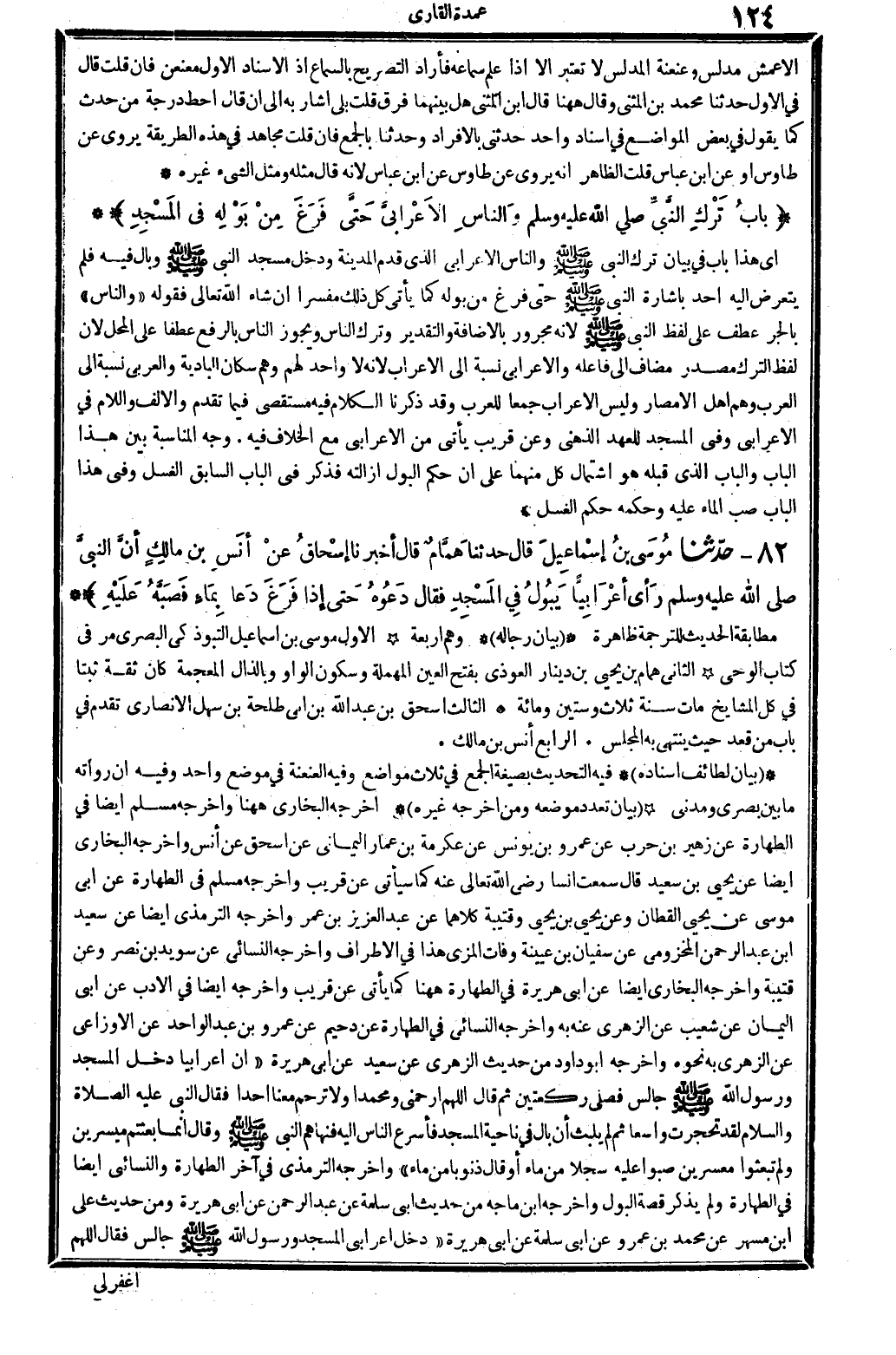 بَيَان تعدد مَوْضِعه وَمن أخرجه غَيره أخرجه البُخَارِيّ هَهُنَا. وَأخرجه مُسلم أَيْضا فِي الطَّهَارَة عَن زُهَيْر بن حَرْب عَن عَمْرو بن يُونُس عَن عِكْرِمَة بن عمار الْيَمَانِيّ عَن إِسْحَاق عَن أنس. وَأخرجه البُخَارِيّ أَيْضا عَن يحيى بن سعيد، قَالَ: سَمِعت أنسا رَضِي الله تَعَالَى عَنهُ، كَمَا سَيَأْتِي عَن قريب. وَأخرجه مُسلم فِي الطَّهَارَة عَن أبي مُوسَى عَن يحيى بن الْقطَّان، وَعَن يحيى بن يحيى وقتيبة، وَكِلَاهُمَا عَن عبد الْعَزِيز بن عمر. وَأخرجه التِّرْمِذِيّ أَيْضا عَن سعيد ابْن عبد الرَّحْمَن المَخْزُومِي عَن سُفْيَان بن عُيَيْنَة، وَفَاتَ الْمزي هَذَا فِي الْأَطْرَاف. وَأخرجه النَّسَائِيّ عَن سُوَيْد بن نصر وَعَن قُتَيْبَة. وَأخرجه البُخَارِيّ أَيْضا عَن ابي هُرَيْرَة فِي الطَّهَارَة هَهُنَا، كَمَا يَأْتِي عَن قريب. وَأخرجه أَيْضا فِي الْأَدَب عَن ابي الْيَمَان عَن شُعَيْب عَن الزُّهْرِيّ عَنهُ بِهِ. وَأخرجه النَّسَائِيّ فِي الطَّهَارَة عَن دُحَيْم عَن عَمْرو بن عبد الْوَاحِد عَن الْأَوْزَاعِيّ عَن الزُّهْرِيّ بِهِ نَحوه. وَأخرجه أَبُو دَاوُد من حَدِيث الزُّهْرِيّ عَن سعيد عَن أبي هُرَيْرَة: (أَن أَعْرَابِيًا دخل الْمَسْجِد وَرَسُول الله صلى الله عَلَيْهِ وَسلم جَالس، فصلى رَكْعَتَيْنِ ثمَّ قَالَ: اللَّهُمَّ ارْحَمْنِي ومحمداً، وَلَا ترحم مَعنا أحدا. فَقَالَ النَّبِي، عَلَيْهِ الصَّلَاة وَالسَّلَام، لقد تحجرت وَاسِعًا، ثمَّ لم يلبث أَن بَال فِي نَاحيَة الْمَسْجِد، فأسرع النَّاس إِلَيْهِ فنهاهم النَّبِي صلى الله عَلَيْهِ وَسلم وَقَالَ: إِنَّمَا بعثتم ميسرين وَلم تبعثوا معسرين، صبوا عَلَيْهِ سجلاً من مَاء، أَو قَالَ؛ ذنوباً من مَاء) . وَأخرجه التِّرْمِذِيّ فِي آخر الطَّهَارَة، وَالنَّسَائِيّ أَيْضا فِي الطَّهَارَة، وَلم يذكر قصَّة الْبَوْل. وَأخرجه ابْن مَاجَه من حَدِيث ابي سَلمَة عَن عبد الرَّحْمَن عَن أبي هُرَيْرَة، وَمن حَدِيث عَليّ ابْن مسْهر عَن مُحَمَّد بن عَمْرو عَن أبي سَلمَة عَن أبي هُرَيْرَة: (دخل أَعْرَابِي الْمَسْجِد وَرَسُول الله صلى الله عَلَيْهِ وَسلم جَالس، فَقَالَ: اللَّهُمَّ