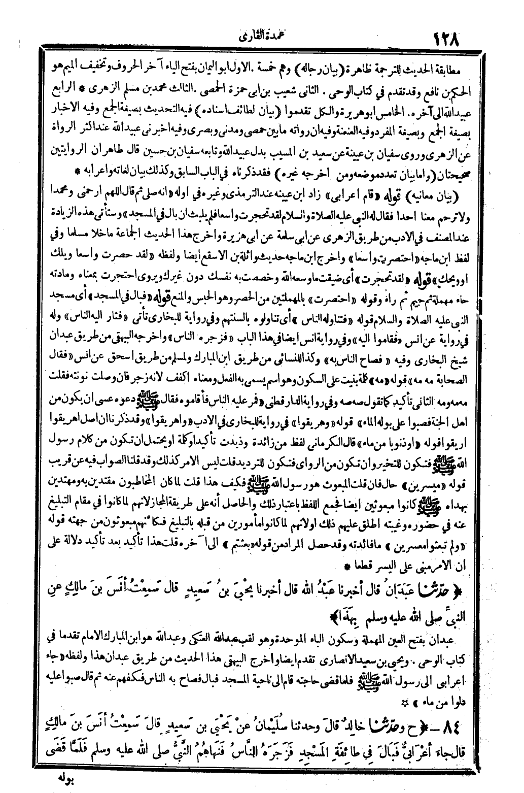 وحدّثنا خالِدٌ وَحدثنَا سُلَيْمانُ عنْ يَحْيَى بن سَعِيدٍ قالَ سَمِعْتُ أنَسَ بنَ مالِكٍ قَالَ جاءَ أعْرَابيٌّ فَبَالَ فِي طائِفَةِ الَمسْجِدِ فَزَجَرَهُ النَّاسُ فَنَهاهُمُ النَّبيُّ صلى الله عَلَيْهِ وَسلم فَلَمَّا قَضَى