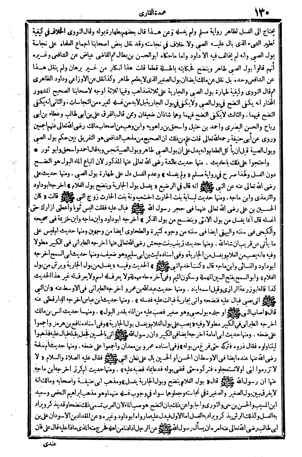 وَاحْتَجُّوا على ذَلِك باحاديث مِنْهَا: حَدِيث عَائِشَة، رَضِي الله تَعَالَى عَنْهَا، الْمَذْكُور. لِأَن إتباع المَاء الْبَوْل هُوَ النَّضْح دون الْغسْل، وَلِهَذَا صرح فِي رِوَايَة مُسلم: (وَلم يغسلهُ) ، وَعدم الْغسْل دلّ على طَهَارَة بَوْل الصَّبِي. وَمِنْهَا: حَدِيث عَليّ، رَضِي الله تَعَالَى عَنهُ، عَن النَّبِي صلى الله عَلَيْهِ وَسلم أَنه قَالَ فِي الرَّضِيع: (يغسل بَوْل الْجَارِيَة وينضح بَوْل الْغُلَام) ، أخرجه أَبُو دَاوُد وَالتِّرْمِذِيّ وَابْن مَاجَه. وَمِنْهَا: حَدِيث لبَابَة بنت الْحَارِث، أُخْت مَيْمُونَة بنت الْحَارِث زوج النَّبِي صلى الله عَلَيْهِ وَسلم، قَالَت: (كَانَ الْحُسَيْن بن عَليّ، رَضِي الله تَعَالَى عَنْهُمَا، فِي حجر رَسُول الله صلى الله عَلَيْهِ وَسلم فَبَال عَلَيْهِ، فَقلت: إلبس ثوبا وَأَعْطِنِي إزارك حَتَّى أغسله. قَالَ: إِنَّمَا يغسل من بَوْل الْأُنْثَى وينضح من بَوْل الذّكر) ، أخرجه أَبُو دَاوُد وَابْن مَاجَه وَابْن خُزَيْمَة فِي (صَحِيحه) والكبحي فِي (سنَنه) وَالْبَيْهَقِيّ أَيْضا فِي (سنَنه) من وُجُوه كَثِيرَة، والطَّحَاوِي أَيْضا من وَجْهَيْن. وَمِنْهَا: حَدِيث أم قيس على مَا يَأْتِي عَن قريب إِن شَاءَ الله. وَمِنْهَا: حَدِيث زَيْنَب بنت جحش، رَضِي الله تَعَالَى عَنْهَا، أخرجه الطَّبَرَانِيّ فِي (الْكَبِير) مطولا، وَفِيه: (أَنه يصب من الْغُلَام وَيغسل من الْجَارِيَة) ، وَفِي إِسْنَاده: لَيْث بن أبي سليم وَهُوَ ضَعِيف. وَمِنْهَا: حَدِيث أبي السَّمْح، أخرجه أَبُو دَاوُد وَالنَّسَائِيّ وَابْن مَاجَه قَالَ: (كنت أخدم النَّبِي صلى الله عَلَيْهِ وَسلم ... .) الحَدِيث، وَفِيه: (يغسل من بَوْل الْجَارِيَة ويرش من بَوْل الْغُلَام) ، وَأَبُو السَّمْح، بِفَتْح السِّين الْمُهْملَة وَسُكُون الْمِيم وَفِي آخِره حاء مُهْملَة، وَلَا يعرف لَهُ اسْم وَلَا يعرف لَهُ غير هَذَا الحَدِيث، كَذَا قَالَه ابو زرْعَة الرَّازِيّ، وَقيل: اسْمه إياد. وَمِنْهَا: حَدِيث عبد الله بن عَمْرو، أخرجه الطَّبَرَانِيّ فِي (الْأَوْسَط) عَنهُ: (أَن النَّبِي صلى الله عَلَيْهِ وَسلم أَتَى بصبي فَبَال عَلَيْهِ، فنضحه وَأتي بِجَارِيَة فبالت عَلَيْهِ فَغسله) . وَمِنْهَا: حَدِيث ابْن عَبَّاس، أخرجه الدَّارَقُطْنِيّ عَنهُ، قَالَ: (أصَاب النَّبِي صلى الله عَلَيْهِ وَسلم أَو، جلده، بَوْل صبي وَهُوَ صَغِير، فصب عَلَيْهِ من المَاء بِقدر الْبَوْل) . وَمِنْهَا: حَدِيث أنس بن مَالك أخرجه الطَّبَرَانِيّ فِي (الْكَبِير) مطولا، وَفِيه: (يصب على بَوْل الْغُلَام وَيغسل بَوْل الْجَارِيَة) . وَفِي إِسْنَاده نَافِع بن هُرْمُز، وَأَجْمعُوا على ضعفه. وَمِنْهَا: حَدِيث أبي أُمَامَة، أخرجه أَيْضا فِي (الْكَبِير) : (أَن رَسُول الله صلى الله عَلَيْهِ وَسلم أَتَى بالحسين فَجعل يقبله، فَبَال عَلَيْهِ، فَذَهَبُوا ليتناولوه فَقَالَ: ذرْوَة، فَتَركه حَتَّى فرغ من بَوْله) . وَفِي إِسْنَاده عَمْرو بن معدان، وَأَجْمعُوا على ضعفه. وَمِنْهَا: حَدِيث أم سَلمَة، رَضِي الله عَنْهَا، عِنْده أَيْضا فِي (الْأَوْسَط) أَن الْحسن، أَو الْحُسَيْن، بَال على بطن النَّبِي صلى الله عَلَيْهِ وَسلم فَقَالَ، عَلَيْهِ الصَّلَاة وَالسَّلَام: (لَا تزرموا ابْني أَو، لَا تستعجلوه، فَتَرَكُوهُ حَتَّى قضى بَوْله، فَدَعَا بِمَاء فَصَبَّهُ عَلَيْهِ) . وَمِنْهَا: حَدِيث أم كرز، أخرجه ابْن مَاجَه عَنْهَا أَن رَسُول الله صلى الله عَلَيْهِ وَسلم قَالَ: (بَوْل الْغُلَام ينضح وَبَوْل الْجَارِيَة يغسل) ، وَمذهب أبي حنيفَة وَأَصْحَابه وَمَالك أَنه لَا يفرق بَين بَوْل الصَّغِير وَالصَّغِيرَة فِي نَجَاسَته، وجعلوهما سَوَاء فِي وجوب غسله مِنْهُمَا، وَهُوَ مَذْهَب إِبْرَاهِيم النَّخعِيّ وَسَعِيد ابْن الْمسيب وَالْحسن بن حَيّ وَالثَّوْري.