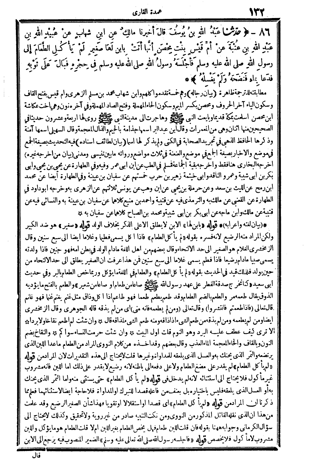 بَيَان لغته وَإِعْرَابه قَوْله: (بابنٍ لَهَا) الإبن: لَا يُطلق إلاَّ على الذّكر بِخِلَاف: الْوَلَد. قَوْله: (صَغِير) هُوَ ضد: الْكَبِير، وَلَكِن المُرَاد مِنْهُ: الرَّضِيع، لِأَنَّهُ فسره بقوله: (لم يَأْكُل الطَّعَام) ، فَإِذا أكل يُسمى: فطيماً، وَغُلَامًا أَيْضا إِلَى سبع سِنِين. وَقَالَ الزَّمَخْشَرِيّ: الْغُلَام هُوَ الصَّغِير إِلَى حد الالتحاء. وَقَالَ بَعضهم من أهل اللُّغَة: مَا دَامَ الْوَلَد فِي بطن أمه فَهُوَ: جَنِين، فاذا وَلدته يُسمى: صَبيا مَا دَامَ رضيعاً، فَإِذا فطم يُسمى غُلَاما إِلَى سبع سِنِين، فَمن هَذَا عرفت أَن الصَّغِير يُطلق إِلَى حد الالتحاء من حِين يُولد، فَلذَلِك قيد فِي الْحَدث بقوله: (لم يَأْكُل الطَّعَام) ، وَالطَّعَام فِي اللُّغَة مَا يُؤْكَل، وَرُبمَا خص الطَّعَام بِالْبرِّ، وَفِي حَدِيث أبي سعيد: (كُنَّا نخرج صَدَقَة الْفطر على عهد رَسُول الله صلى الله عَلَيْهِ وَسلم صَاعا من طَعَام أَو صَاعا من شعير) . والطعم، بِالْفَتْح: مَا يُؤَدِّيه الذَّوْق، وَيُقَال: طعمه مر، والطعم، بِالضَّمِّ: الطَّعَام: وَقد طعم يطعم طعماً فَهُوَ طاعم إِذا أكل وذاق، مثل: غنم يغنم غنما فَهُوَ غَانِم، الذَّوْق، يُقَال: طعمه مر، والطعم، بِالضَّمِّ: الطَّعَام. وَقد طعم يطعم طعماً فَهُوَ طاعم إِذا أكل وذاق، مثل: غنم يغنم غنما فَهُوَ غَانِم، قَالَ تَعَالَى: {فاذا طَعِمْتُمْ فَانْتَشرُوا} (الْأَحْزَاب: 53) وَقَالَ تَعَالَى: {وَمن لم يطعمهُ فانه منى} (الْبَقَرَة: 249) اي: من لم يذقه، قَالَه الْجَوْهَرِي. وَقَالَ الزَّمَخْشَرِيّ أَيْضا: وَمن لم يطعمهُ وَمن لم يذقه، من طعم الشَّيْء إِذا ذاقه. وَمِنْه: طعم الشَّيْء لمذاقه، قَالَ: