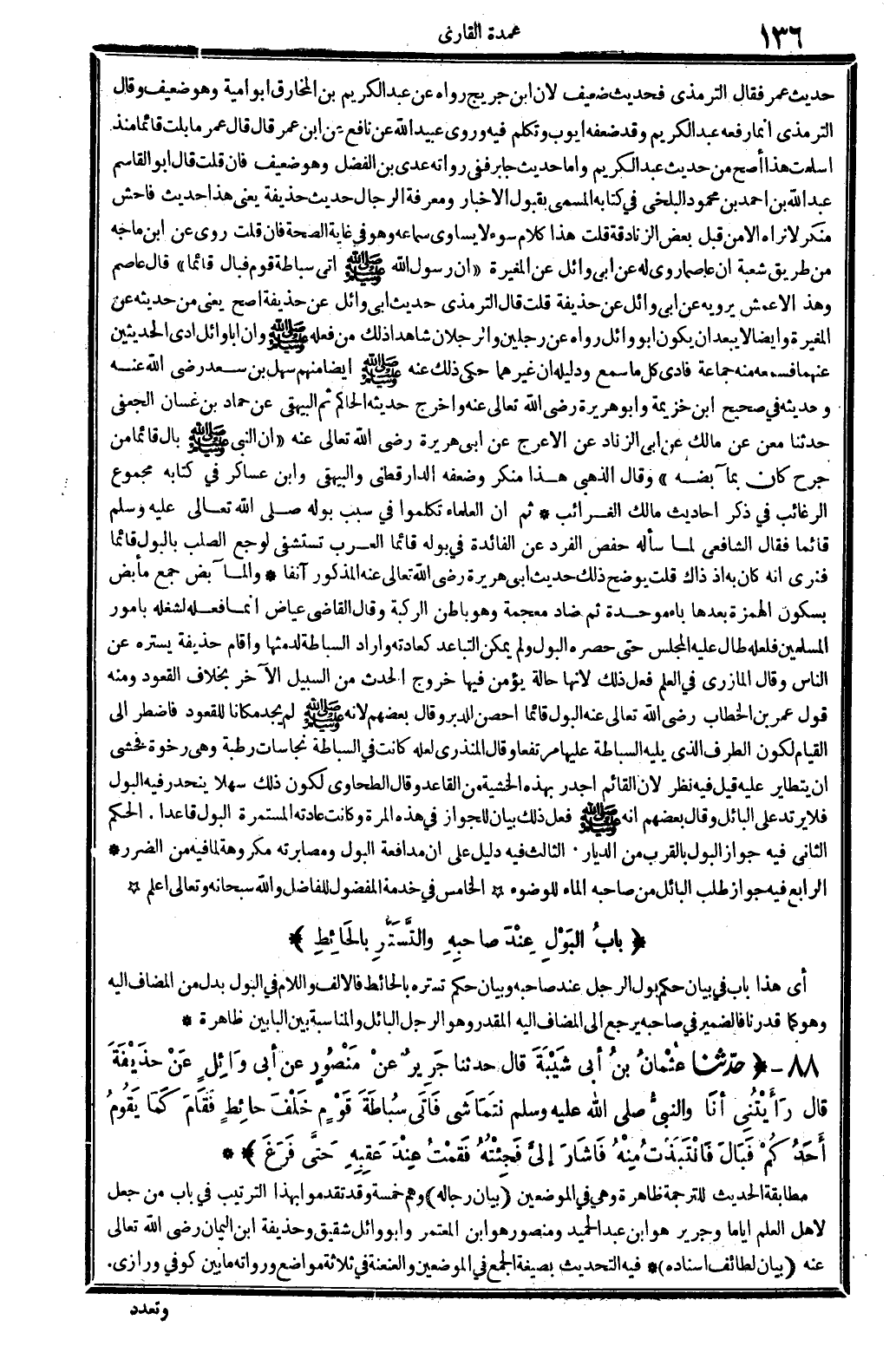 حَدِيث عمر فَقَالَ التِّرْمِذِيّ: فَحَدِيث ضَعِيف، لِأَن ابْن جريج رَوَاهُ عَن عبد الْكَرِيم بن الْمخَارِق أَبُو امية وَهُوَ ضَعِيف، وَقَالَ التِّرْمِذِيّ: إِنَّمَا رَفعه عبد الْكَرِيم، وَقد ضعفه أَيُّوب، وَتكلم فِيهِ، وروى عبيد الله عَن نَافِع عَن ابْن عمر: قَالَ: عمر: مَا بلت قَائِما مُنْذُ أسلمت، هَذَا أصح من حَدِيث عبد الْكَرِيم. وَأما حَدِيث جَابر، فَفِي رُوَاته: عدي بن الْفضل وَهُوَ ضَعِيف. فان قلت: قَالَ أَبُو الْقَاسِم عبد الله بن أَحْمد بن مَحْمُود الْبَلْخِي فِي كِتَابه الْمُسَمّى (بِقبُول الْأَخْبَار وَمَعْرِفَة الرِّجَال) : حَدِيث حُذَيْفَة يَعْنِي هَذَا حَدِيث فَاحش مُنكر لَا نراهه إلاَّ من قبل بعض الزَّنَادِقَة. قلت: هَذَا كَلَام سوء لَا يُسَاوِي سَمَاعه، وَهُوَ فِي غَايَة الصِّحَّة. فَإِن قلت: رُوِيَ عَن ابْن مَاجَه من طَرِيق شُعْبَة أَن عَاصِمًا روى لَهُ عَن أبي وَائِل عَن الْمُغيرَة: (أَن رَسُول الله صلى الله عَلَيْهِ وَسلم اتى سباطة قوم فَبَال قَائِما) . قَالَ عَاصِم: وَهَذَا الاعمش يرويهِ عَن أبي وَائِل عَن حُذَيْفَة. قلت: قَالَ التِّرْمِذِيّ: حَدِيث أبي وَائِل عَن حديفة أصح، يَعْنِي من حَدِيثه عَن الْمُغيرَة، وَأَيْضًا لَا يبعد أَن يكون أَبُو وَائِل رَوَاهُ عَن رجلَيْنِ، وَالرجلَانِ شَاهدا ذَلِك من فعله صلى الله عَلَيْهِ وَسلم، وَأَن أَبَا وَائِل أدّى الْحَدِيثين عَنْهُمَا، فَسَمعهُ مِنْهُ جمَاعَة فَأدى كلٌّ مَا سمع، وَدَلِيله أَن غَيرهمَا حكى ذَلِك عَنهُ صلى الله عَلَيْهِ وَسلم أَيْضا، مِنْهُم: سهل بن سعد، رَضِي الله عَنهُ. وَفِي حَدِيثه فِي (صَحِيح ابْن خزيمه) وَأَبُو هُرَيْرَة، رَضِي الله تَعَالَى عَنهُ، وَأخرج حَدِيثه الْحَاكِم ثمَّ الْبَيْهَقِيّ عَن حَمَّاد بن غَسَّان الْجعْفِيّ: حَدثنَا معن عَن مَالك عَن أبي الزِّنَاد عَن الْأَعْرَج عَن ابي هُرَيْرَة، رَضِي الله تَعَالَى عَنهُ: (أَن النَّبِي صلى الله عَلَيْهِ وَسلم بَال قَائِما من جرح كَانَ بمآبضه) ، وَقَالَ الذَّهَبِيّ: هَذَا مُنكر، وَضَعفه الدَّارَقُطْنِيّ وَالْبَيْهَقِيّ وَابْن عَسَاكِر فِي كِتَابه (مَجْمُوع الرغائب فِي ذكر أَحَادِيث مَالك الغرائب) .