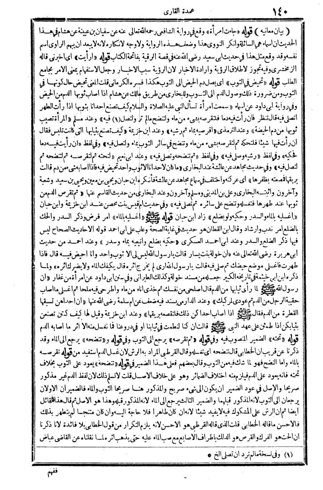 فِيهِ) . وَعند مُسلم: (الْمَرْأَة تصيب ثوبها من دم الْحَيْضَة) ، وَعند التِّرْمِذِيّ: (إقرصيه بِمَاء ثمَّ رشيه) . وَعند ابْن خُزَيْمَة: (كَيفَ تصنع بثيابها الَّتِي كَانَت تلبس؟ فَقَالَ إِن رَأَتْ فِيهَا شَيْئا فلتحكه ثمَّ لتقرصه بِشَيْء من مَاء، وتنضح فِي سَائِر الثَّوْب بِمَاء، ولتصل فِيهِ) . وَفِي لفظ: (إِن رَأَيْت فِيهِ دَمًا فحكيه) . وَفِي لفظ: (رشيه وَصلي فِيهِ) . وَفِي لفظ: (ثمَّ تنضحه وَتصلي فِيهِ) . وَعند أبي نعيم: (لتحته ثمَّ لتقرصه ثمَّ لتنضحه ثمَّ لتصل فِيهِ) . وَفِي حَدِيث مُجَاهِد عَن عَائِشَة البُخَارِيّ: (مَا كَانَ لإحدانا إلاَّ ثوب وَاحِد تحيض فِيهِ، فَإِذا أَصَابَهُ شَيْء من دم قَالَت بريقها، فمعنعته بظفرها) . أَي: عركته. وَاخْتلف فِي سَماع مُجَاهِد عَن عَائِشَة، فَأنكرهُ ابْن حبَان وَيحيى بن معِين وَيحيى بن سعيد وَشعْبَة وَآخَرُونَ، وأثبته البُخَارِيّ وَعلي بن الْمَدِينِيّ وَمُسلم وَآخَرُونَ، وَعند البُخَارِيّ من حَدِيث الْقَاسِم عَنْهَا: (ثمَّ تقرص الدَّم من ثوبها عِنْد طهرهَا فتغسله وتنضح على سائره ثمَّ تصلي فِيهِ) . وَفِي حَدِيث أم قيس بنت مُحصن، عِنْد ابْن خُزَيْمَة، وَابْن حبَان: (إغسليه بِالْمَاءِ والسدر وحكيه وَلَو بضلع) ، زَاد ابْن حبَان قَوْله صلى الله عَلَيْهِ وَسلم: (اغسليه بِالْمَاءِ) ، أَمر فرض، وَذكر السدر والحك بالضلع أَمر ندب وإرشاد. وَقَالَ ابْن الْقطَّان: هُوَ حَدِيث فِي غَايَة الصِّحَّة، وَعَابَ على أبي أَحْمد قَوْله: الْأَحَادِيث الصِّحَاح لَيْسَ فِيهَا ذكر الضلع والسدر، وَعند أبي أَحْمد العسكري: (حكيه بضلع واتبعيه بِمَاء وَسدر) . وَعند أَحْمد من حَدِيث أبي هُرَيْرَة، رَضِي الله تَعَالَى عَنهُ: (إِن خَوْلَة بنت يسَار قَالَت: يَا رَسُول الله لَيْسَ لي إلاَّ ثوب وَاحِد، وَأَنا أحيض فِيهِ، قَالَ: فَإِذا طهرت فاغسلي مَوضِع حيضك ثمَّ صلي فِيهِ، قَالَت: يَا رَسُول الله أرى لم يخرج اثره، قَالَ: يَكْفِيك المَاء وَلَا يَضرك أَثَره) . وَلما ذكره ابْن أبي خَيْثَمَة فِي (تَارِيخه الْكَبِير) جعله من مُسْند خَوْلَة، وَكَذَلِكَ الطَّبَرَانِيّ، وَفِي (سنَن أبي دَاوُد) عَن امْرَأَة من غفار: (أَن رَسُول الله صلى الله عَلَيْهِ وَسلم لما رأى ثِيَابهَا من الدَّم، قَالَ: أصلحي من نَفسك، ثمَّ خذي إِنَاء من مَاء واطرحي فِيهِ ملحاً، ثمَّ اغسلي مَا أصَاب حقيبة الرجل من الدَّم، ثمَّ عودي لمركبك) . وَعند الدَّارمِيّ، بِسَنَد فِيهِ ضعف عَن أم سَلمَة، رَضِي الله عَنْهَا: (إِن إِحْدَاهُنَّ تسبقها القطرة من الدَّم. فَقَالَ صلى الله عَلَيْهِ وَسلم: إِذا أصَاب إحداكن بذلك فلتقصعه بريقها. وَعند ابْن خُزَيْمَة: وَقيل لَهَا: كَيفَ كنتن تصنعن بثيابكن إِذا طمثن على عهد النَّبِي صلى الله عَلَيْهِ وَسلم؟ قَالَت: إِن كُنَّا لنطمث فِي ثيابنا أَو فِي دروعنا، فَمَا نغسل مِنْهُ إلاَّ أثر مَا أَصَابَهُ الدَّم. قَوْله: (تَحْتَهُ) الضَّمِير الْمَنْصُوب فِيهِ، وَفِي قَوْله: (ثمَّ تقرصه) يرجع إِلَى الثَّوْب. وَفِي قَوْله: و (تنضحه) يرجع إِلَى المَاء، وَقد ذكرنَا عَن قريب أَن الخاطبي قَالَ: تنضحه أَي: تغسله. وَقَالَ الْقُرْطُبِيّ: المُرَاد بِهِ الرش، لِأَن غسل الدَّم اسْتُفِيدَ من قَوْله: (تقرصه بِالْمَاءِ) ، وَأما النَّضْح فَهُوَ لما شكّ فِيهِ من الثَّوْب. وَقَالَ بَعضهم: فعلى هَذَا الضَّمِير فِي قَوْله: (تنضحه) يعود على الثَّوْب، بِخِلَاف: تَحْتَهُ، فَإِنَّهُ يعود على الدَّم، فَيلْزم مِنْهُ إختلاف الضمائر، وَهُوَ على خلاف الأَصْل. قلت: لَا نسلم ذَلِك، لِأَن لفظ: الدَّم، غير مَذْكُور صَرِيحًا، وَالْأَصْل فِي عود الضَّمِير أَن يكون إِلَى شَيْء صَرِيح، وَالْمَذْكُور هُنَا صَرِيحًا: الثَّوْب وَالْمَاء، فالضميران الْأَوَّلَانِ يرجعان إِلَى الثَّوْب لِأَنَّهُ الْمَذْكُور قبلهمَا، وَالضَّمِير الثَّالِث يرجع إِلَى: المَاء، لِأَنَّهُ الْمَذْكُور قبله، وَهَذَا هُوَ ال