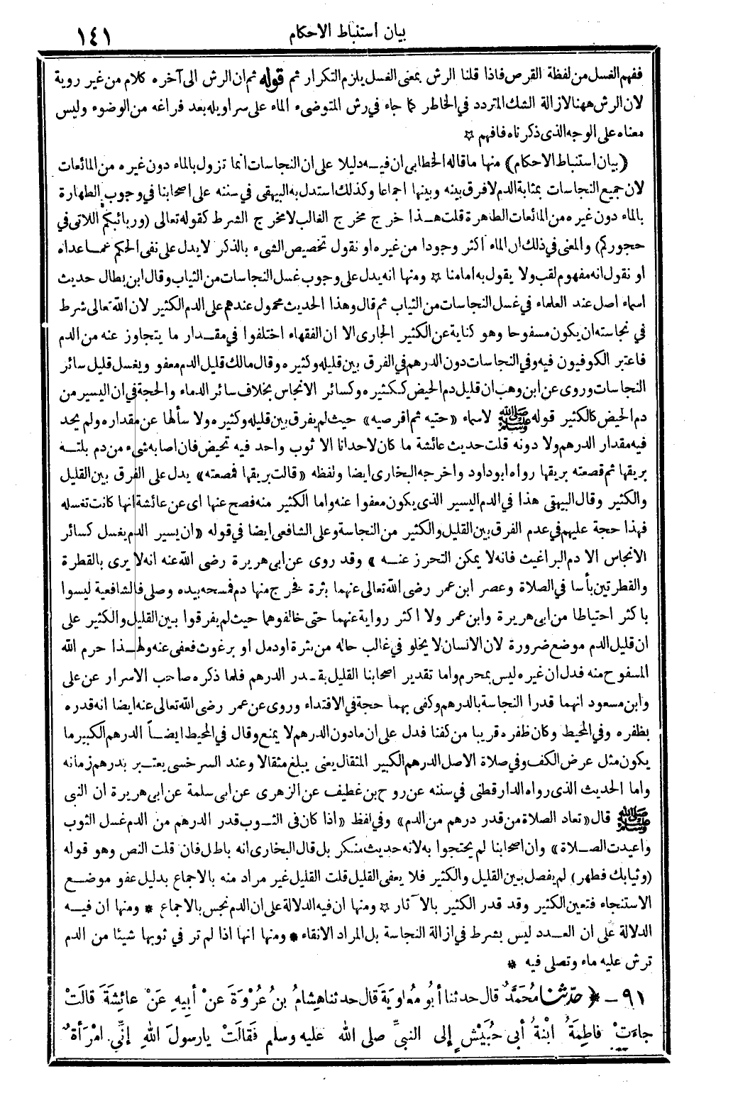 وَمِنْهَا: أَنه يدل على وجوب غسل النَّجَاسَات من الثِّيَاب، وَقَالَ ابْن بطال: حَدِيث أَسمَاء أصل عِنْد الْعلمَاء فِي غسل النَّجَاسَات من الثِّيَاب، ثمَّ قَالَ: وَهَذَا الحَدِيث مَحْمُول عِنْدهم على الدَّم الْكثير، لِأَن الله تَعَالَى شَرط فِي نَجَاسَته أَن يكون مسفوحاً، وَهُوَ كِنَايَة عَن الْكثير الْجَارِي إلاَّ أَن الْفُقَهَاء اخْتلفُوا فِي مِقْدَار مَا يتَجَاوَز عَنهُ من الدَّم، فَاعْتبر الْكُوفِيُّونَ فِيهِ، وَفِي النَّجَاسَات دون الدِّرْهَم فِي الْفرق بَين قَلِيله وَكَثِيره. وَقَالَ مَالك: قَلِيل الدَّم مَعْفُو، وَيغسل قَلِيل سَائِر النَّجَاسَات. وَرُوِيَ عَن ابْن وهب: إِن قَلِيل دم الْحيض ككثيره وكسائر الأنجاس، بِخِلَاف سَائِر الدِّمَاء، وَالْحجّة فِي أَن الْيَسِير من دم الْحيض كالكثير قَوْله صلى الله عَلَيْهِ وَسلم لأسماء: (حتيه ثمَّ اقرصيه) ، حَيْثُ لم يفرق بَين قَلِيله وَكَثِيره، وَلَا سَأَلَهَا عَن مِقْدَاره وَلم يحد فِيهِ مِقْدَار الدِّرْهَم وَلَا دونه. قلت: حَدِيث عَائِشَة: (مَا كَانَ لإحدانا إلاَّ ثَوَاب وَاحِد فِيهِ تحيض فَإِن أَصَابَهُ شَيْء من دم بلته بريقها، ثمَّ قصعته بريقها) رَوَاهُ أَبُو دَاوُد، وَأخرجه البُخَارِيّ أَيْضا، وَلَفظه: (قَالَت بريقها فمصعته) ، يدل على الْفرق بَين الْقَلِيل وَالْكثير، وَقَالَ الْبَيْهَقِيّ: هَذَا فِي الدَّم الْيَسِير الَّذِي يكون معفواً عَنهُ، وَأما الْكثير مِنْهُ فصح عَنْهَا. أَي: عَن عَائِشَة. أَنَّهَا كَانَت تغسله، فَهَذَا حجَّة عَلَيْهِم فِي عدم الْفرق بَين الْقَلِيل وَالْكثير من النَّجَاسَة، وعَلى الشَّافِعِي أَيْضا فِي قَوْله: (إِن يسير الدَّم يغسل كَسَائِر الأنجاس إلاَّ دم الراغيث، فَإِنَّهُ لَا يُمكن التَّحَرُّز عَنهُ) . وَقد رُوِيَ عَن أبي هُرَيْرَة، رَضِي الله عَنهُ، أَنه لَا يرى بالقطرة والقطرتين بَأْسا فِي الصَّلَاة، وعصر ابْن عمر، رَضِي الله تَعَالَى عَنْهُمَا، بثرة فَخرج مِنْهَا دم فمسحه بِيَدِهِ وَصلى، فالشافعية لَيْسُوا بإكثر إحتياطاً من أبي هُرَيْرَة وَابْن عمر، وَلَا أَكثر رِوَايَة عَنْهُمَا حَتَّى خالفوهما، حَيْثُ لم يفرقُوا بَين الْقَلِيل وَالْكثير، على أَن قَلِيل الدَّم مَوضِع ضَرُورَة، لِأَن الْإِنْسَان لَا يَخْلُو فِي غَالب حَاله من بثرة أَو دمل أَو برغوث، فعفى عَنهُ، وَلِهَذَا حرم الله المسفوح مِنْهُ، فَدلَّ أَن غَيره لَيْسَ بِمحرم، وَأما تَقْدِير أَصْحَابنَا الْقَلِيل بِقدر الدِّرْهَم، فَلَمَّا ذكره صَاحب (الاسرار) عَن عَليّ وَابْن مَسْعُود أَنَّهُمَا قدرا النَّجَاسَة بالدرهم، وكفي بهما حجَّة فِي الِاقْتِدَاء. وَرُوِيَ عَن عمر، رَضِي الله تَعَالَى عَنهُ، أَيْضا أَنه قدره بظفره، وَفِي (الْمُحِيط) : وَكَانَ ظفره قَرِيبا من كفنا، فَدلَّ على أَن مَا دون الدِّرْهَم لَا يمْنَع. وَقَالَ فِي (الْمُحِيط) أَيْضا: الدِّرْهَم الْكَبِير مَا يكون مثل عرض الْكَفّ، وَفِي صَلَاة الأَصْل: الدِّرْهَم الْكَبِير المثقال يَعْنِي: يبلغ مِثْقَالا. وَعند السَّرخسِيّ: يعْتَبر بدرهم زَمَانه، وَأما الحَدِيث الَّذِي روايه الدَّارَقُطْنِيّ فِي (سنَنه) عَن روح بن غطيف عَن الزُّهْرِيّ عَن أبي سَلمَة عَن أبي هُرَيْرَة أَن النَّبِي صلى الله عَلَيْهِ وَسلم قَالَ: (تُعَاد الصَّلَاة من قدر دِرْهَم من الدَّم) ، وَفِي لفظ: (إِذا كَانَ فِي الثَّوْب قدر الدِّرْهَم من الدَّم غسل الثَّوْب وأعيدت الصَّلَاة) . وَإِن اصحابنا لم يحتجوا بِهِ، لِأَنَّهُ حَدِيث مُنكر، بل قَالَ البُخَارِيّ: إِنَّه بَاطِل. فَإِن قلت: النَّص وَهُوَ قَوْله: {وثيابك فطهر} (المدثر: 4) لم يفصل بَين الْقَلِيل وَالْكثير، فَلَا يُعْفَى الْقَلِيل. قلت: الْقَلِيل غير مُرَاد مِنْهُ بِالْإِجْمَاع بِدَلِيل عَفْو مَوضِع الِاسْتِنْجَاء فَتعين الْكثير، وَقد قدر الْكثير بالآثار.