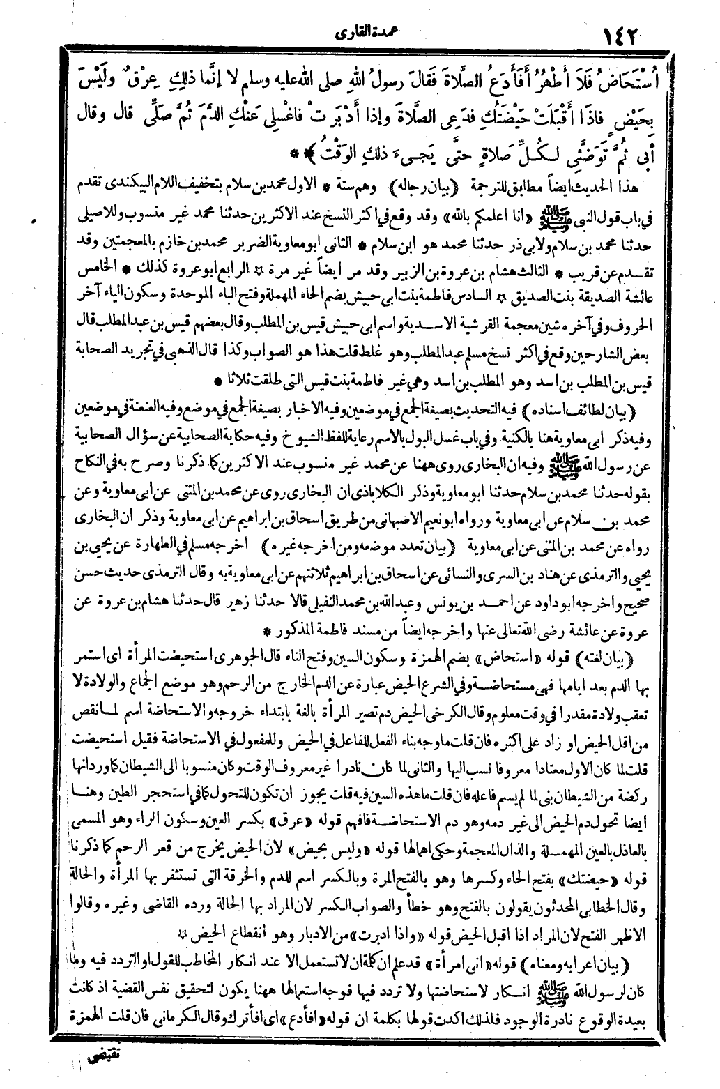 بَيَان لغته قَوْله: (استحاض) ، بِضَم الْهمزَة وَسُكُون السِّين وَفتح التَّاء. قَالَ الْجَوْهَرِي: استحيضت الْمَرْأَة أَي: اسْتمرّ بهَا الدَّم بعد أَيَّامهَا، فَهِيَ مُسْتَحَاضَة. وَفِي الشَّرْع: الْحيض عبارَة عَن الدَّم الْخَارِج من الرَّحِم، وَهُوَ مَوضِع الْجِمَاع والولادة لَا تعقب ولادَة مُقَدرا فِي وَقت مَعْلُوم، وَقَالَ الْكَرْخِي: الْحيض دم تصير الْمَرْأَة بَالِغَة بابتداء خُرُوجه، والاستحاضة اسْم لما نقص من أقل الْحيض أَو زَاد على أَكْثَره. فان قلت: مَا وَجه بِنَاء الْفِعْل للْفَاعِل فِي الْحيض، وللمفعول فِي الِاسْتِحَاضَة؟ فَقيل: استحيضت؟ قلت: لما كَانَ الأول: مُعْتَادا مَعْرُوفا نسب إِلَيْهَا، وَالثَّانِي: لما كَانَ نَادرا غير مَعْرُوف الْوَقْت، وَكَانَ مَنْسُوبا إِلَى الشَّيْطَان، كَمَا ورد أَنَّهَا ركضة من الشَّيْطَان، بني لما لم يسم فَاعله. فَإِن قلت: يجوز أَن تكون للتحول، كَمَا فِي: استحجر الطين، وَهنا أَيْضا تحول دم الْحيض إِلَى غير دَمه، وَهُوَ دم الأستحاضة. فَافْهَم. قَوْله: (عرق) ، بِكَسْر الْعين وَسُكُون الرَّاء: وَهُوَ الْمُسَمّى بالعادل، بِالْعينِ الْمُهْملَة والذال الْمُعْجَمَة، وَحكي إهمالها. قَوْله: (وَلَيْسَ بحيض) لِأَن الْحيض يخرج من قَعْر الرَّحِم كَمَا ذكرنَا. قَوْله: (حيضتك) ، بِفَتْح الْحَاء وَكسرهَا، وَهُوَ بِالْفَتْح: الْمرة، وبالكسر: اسْم للدم، والخرقة الَّتِي تستثفر بهَا الْمَرْأَة وَالْحَالة. وَقَالَ الْخطابِيّ: المحدثون يَقُولُونَ بِالْفَتْح، وَهُوَ خطأ، وَالصَّوَاب الْكسر، لِأَن المُرَاد بهَا الْحَالة، ورده القَاضِي وَغَيره، وَقَالُوا: الْأَظْهر الْفَتْح، لِأَن المُرَاد إِذا أقبل الْحيض. قَوْله: (وَإِذا أَدْبَرت) من: الإدبار وَهُوَ انْقِطَاع الْحيض.