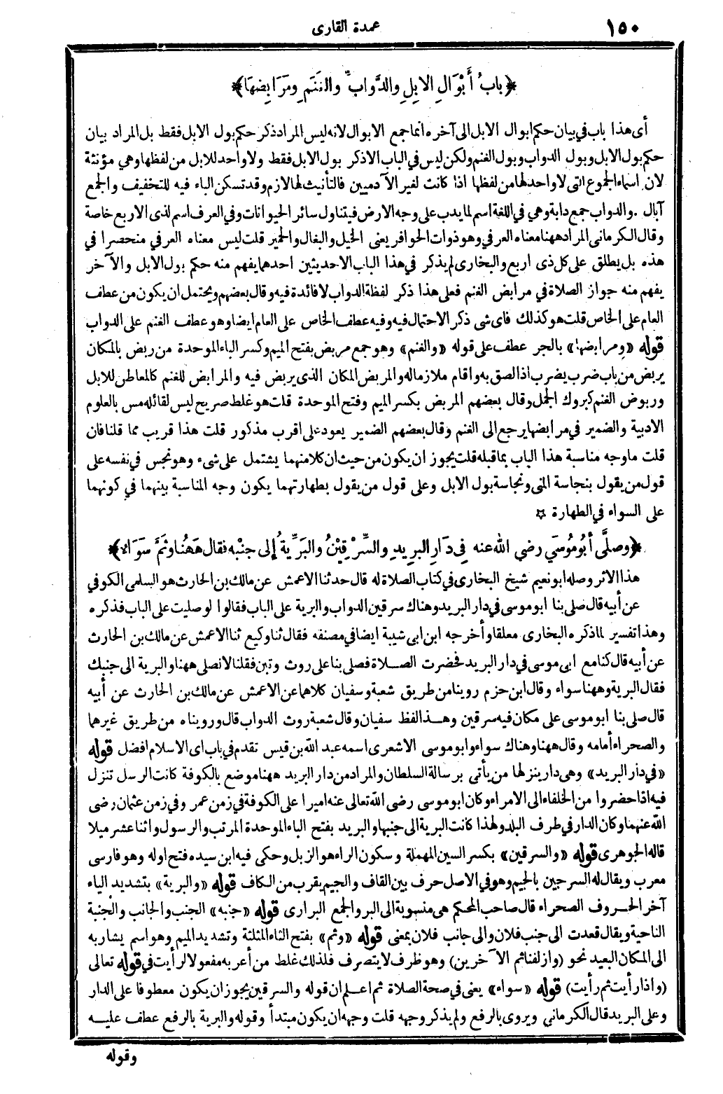 أَي: هَذَا بَاب فِي بَيَان حكم أَبْوَال الْإِبِل ... إِلَى آخِره، إِنَّمَا جمع الأبوال لِأَنَّهُ لَيْسَ المُرَاد ذكر حكم بَوْل الْإِبِل فَقَط، بل المُرَاد بَيَان حكم بَوْل الْإِبِل وَبَوْل الدَّوَابّ وَبَوْل الْغنم، وَلَكِن لَيْسَ فِي البا إلاَّ ذكر بَوْل الْإِبِل فَقَط، وَلَا وَاحِد لِلْإِبِلِ من لَفظهَا، وَهِي مُؤَنّثَة لِأَن أَسمَاء الجموع الَّتِي وَاحِد لَهَا من لَفظهَا، إِذا كَانَت لغير الْآدَمِيّين، فالتأنيث لَهَا لَازم. وَقد تسكن الْبَاء فِيهِ للتَّخْفِيف، وَالْجمع آبال. وَالدَّوَاب: جمع دبة، وَهِي فِي اللُّغَة: اسْم لما يدب على وَجه الأَرْض، فَيتَنَاوَل سَائِر الْحَيَوَانَات. وَفِي الْعرف: اسْم لذِي الْأَرْبَع خَاصَّة. وَقَالَ الْكرْمَانِي: المُرَاد هَهُنَا مَعْنَاهُ الْعرفِيّ، وَهُوَ ذَوَات الحوافر، يَعْنِي: الْخَيل وَالْبِغَال وَالْحمير. قلت: لَيْسَ مَعْنَاهُ الْعرفِيّ منحصراً فِي هَذِه، بل يُطلق على كل ذِي أَربع، وَالْبُخَارِيّ لم يذكر فِي هَذَا الْبَاب إلاَّ حديثين: أَحدهمَا يفهم مِنْهُ حكم بَوْل الْإِبِل. وَالْآخر: يفهم مِنْهُ جَوَاز الصَّلَاة فِي مرابض الْغنم، فعلى هَذَا ذكر لَفظه الدَّوَابّ لَا فَائِدَة فِيهِ. وَقَالَ بَعضهم: وَيحْتَمل أَن يكون من عطف الْعَام على الْخَاص. قلت: هُوَ كَذَلِك، فَأَي شَيْء ذكر الِاحْتِمَال فِيهِ، وَفِيه عطف الْخَاص على الْعَام أَيْضا، وَهُوَ عطف الْغنم على الدَّوَابّ. قَوْله: (ومرابضها) بِالْجَرِّ عطف على قَوْله: (وَالْغنم) وَهُوَ جمع: مربض، بِفَتْح الْمِيم وَكسر الْبَاء الْمُوَحدَة: من ربض بِالْمَكَانِ يربض، من بَاب: ضرب يضْرب، إِذا ألصق بِهِ، وَأقَام ملازماً لَهُ، والمربض: الْمَكَان الَّذِي يربض فِيهِ، والمرابض للغنم كالمعاطن لِلْإِبِلِ، وربوض الْغنم كبروك الْجمل. وَقَالَ بَعضهم: المربض، بِكَسْر الْمِيم وَفتح الْمُوَحدَة؛ قلت: هُوَ غلط صَرِيح لَيْسَ لقائله مس بالعلوم الادبية، وَالضَّمِير فِي: مرابضها، يرجع إِلَى الْغنم. وَقَالَ بعضم: الضَّمِير يعود على أقرب مَذْكُور. قلت: هَذَا قريب مِمَّا قُلْنَا.