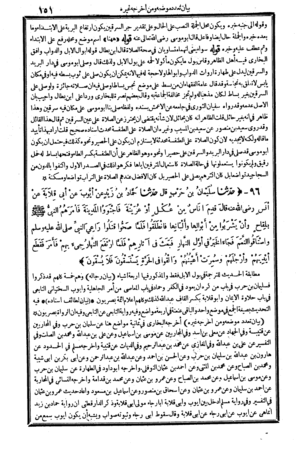 بَيَان تعدد مَوْضِعه وَمن أخرجه غَيره أخرجه البُخَارِيّ فِي ثَمَانِيَة مَوَاضِع: هُنَا عَن سلمَان بن حَرْب، وَفِي الْمُحَاربين عَن قُتَيْبَة، وَفِي الْجِهَاد عَن مُعلى بن اسد، وَفِي الْمُحَاربين عَن مُوسَى بن اسماعيل، وَعَن عَليّ بن عبد الله، وَمُحَمّد بن الصَّلْت، وَفِي التَّفْسِير عَن عَليّ بن عبد الله، وَفِي الْمَغَازِي عَن مُحَمَّد بن عبد الرَّحِيم، وَفِي الدِّيات عَن قُتَيْبَة. وَأخرجه مُسلم فِي الْحُدُود عَن هَارُون بن عبد الله بن سُلَيْمَان بن حَرْب، وَعَن الْحسن بن أَحْمد، وَعَن عبد الله بن عبد الرَّحْمَن، وَعَن أبي بكر بن أبي شيبَة وَمُحَمّد بن الصَّباح، وَعَن مُحَمَّد بن الْمثنى، وَعَن أَحْمد بن عُثْمَان النَّوْفَلِي. وَأخرجه أَبُو دَاوُد فِي الطَّهَارَة عَن سُلَيْمَان بن حَرْب، وَعَن مُوسَى بن إِسْمَاعِيل، وَعَن مُحَمَّد بن الصَّباح، وَعَن عَمْرو بن عُثْمَان، وَعَن مُحَمَّد بن قدامَة. وَأخرجه النَّسَائِيّ فِي الْمُحَاربَة عَن احْمَد بن سُلَيْمَان، وَعَن عَمْرو بن عُثْمَان، وَعَن إِسْحَاق بن مَنْصُور، وَعَن إِسْمَاعِيل بن مَسْعُود، وَأعَاد حَدِيث عَمْرو بن عُثْمَان فِي التَّفْسِير، وَفِي رِوَايَة مُسلم أَدخل بَين أَيُّوب وَأبي قلَابَة أَبَا رَجَاء، مولى أبي قلَابَة، وَذكر الدَّارَقُطْنِيّ أَن رِوَايَة حَمَّاد بن زيد إِنَّمَا هِيَ عَن أَيُّوب عَن أبي رَجَاء عَن أبي قلَابَة. وَقَالَ: سُقُوط أبي رَجَاء وثبوته صَوَاب، وَيُشبه أَن يكون أَيُّوب سمع من