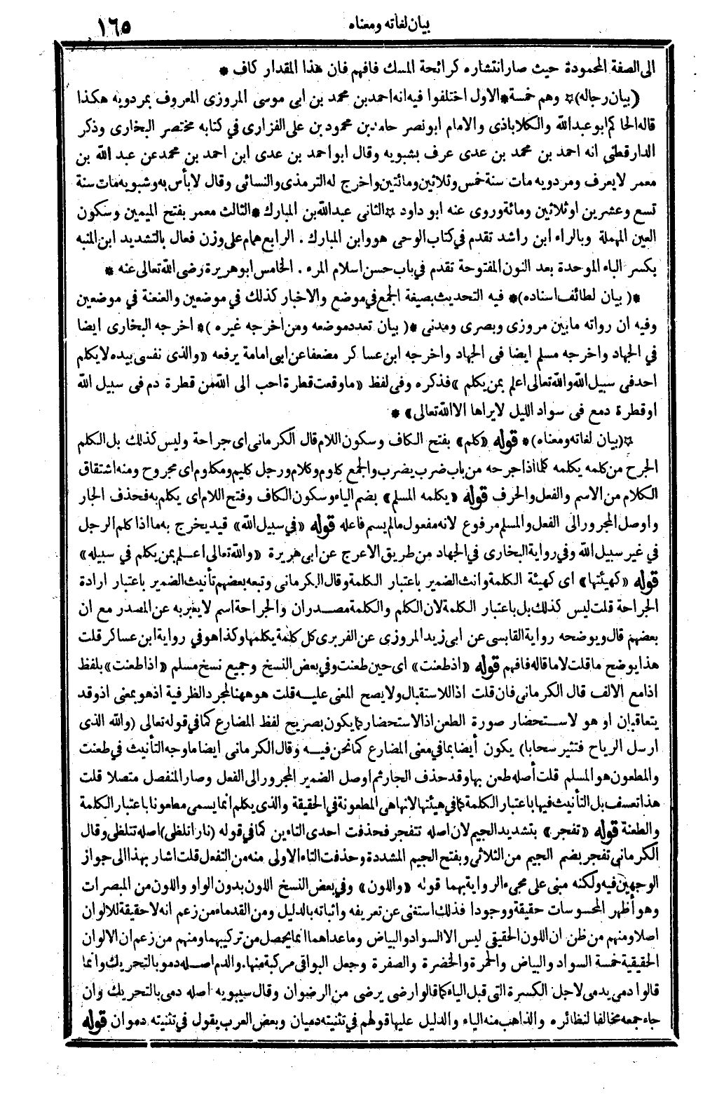 بَيَان لغاته وَمَعْنَاهُ قَوْله: (كلم) بِفَتْح الْكَاف وَسُكُون اللَّام قَالَ الْكرْمَانِي: أَي جِرَاحَة، وَلَيْسَ كَذَلِك، بل الْكَلم الْجرْح من كَلمه يكلمهُ، كلما إِذا جرحه، من بَاب: ضرب يضْرب، وَالْجمع: كلوم وَكَلَام، وَرجل كليم ومكلوم أَي: مَجْرُوح، وَمِنْه اشتقاق الْكَلَام من الِاسْم وَالْفِعْل والحرف. قَوْله: (يكلمهُ الْمُسلم) بِضَم الْيَاء وَسُكُون الْكَاف وَفتح اللَّام أَي يكلم بِهِ فَحذف الْجَار وأوصل الْمَجْرُور إِلَى الْفِعْل، وَالْمُسلم، مَرْفُوع لِأَنَّهُ مفعول مَا لم يسم فالعه. قَوْله: (فِي سَبِيل الله) قيد يخرج بِهِ مَا إِذا كلم الرجل فِي غير سَبِيل الله وَفِي رِوَايَة البُخَارِيّ فِي الْجِهَاد من طَرِيق الْأَعْرَج عَن أبي هُرَيْرَة: (وَالله تَعَالَى أعلم بِمن يكلم فِي سَبيله) . قَوْله: (كهيئتها) أَي: كَهَيئَةِ الْكَلِمَة وأنث الضَّمِير بِاعْتِبَار الْكَلِمَة وَقَالَ الْكرْمَانِي: وَتَبعهُ بَعضهم تَأْنِيث الضَّمِير بِاعْتِبَار إِرَادَة الْجراحَة. قلت: لَيْسَ، كَذَلِك بل بِاعْتِبَار الْكَلِمَة لِأَن الْكَلم والكلمة مصدران، والجراحة اسْم لَا يعبر بِهِ عَن الْمصدر، مَعَ أَن بَعضهم قَالَ: ويوضحه، رِوَايَة القايسي عَن أبي زيد الْمروزِي عَن الفريري كل كلمة يكلمها وَكَذَا هُوَ فِي رِوَايَة ابْن عَسَاكِر. قلت: هَذَا يُوضح مَا قلت لَا مَا قَالَه. فَافْهَم قَوْله: (إِذْ طعنت) أَي: حِين طعنت، وَفِي بعض النّسخ وَجَمِيع نسخ مُسلم: إِذا طعنت) بِلَفْظ: إِذا مَعَ الْألف، قَالَ الْكرْمَانِي: فَإِن قلت: إِذْ للاستقبال وَلَا يَصح الْمَعْنى عَلَيْهِ قلت: هُوَ هَاهُنَا لمجر، الظَّرْفِيَّة، إِذْ هُوَ بِمَعْنى إِذْ وَقد يتعاقبان أَو هُوَ لاستحضار صُورَة الطعْن، إِذْ الاستحضار كَمَا يكون بِصَرِيح لفظ الْمُضَارع، كَمَا فِي قَوْله تَعَالَى: {وَالله الَّذِي أرسل الرِّيَاح فتثير سحاباً} (الرّوم: 248) يكون أَيْضا بِمَا فِي معنى الْمُضَارع، كَمَا نَحن فِيهِ وَقَالَ الْكرْمَانِي: أَيْضا مَا وَجه التَّأْنِيث فِي طعنت المطعون هُوَ الْمُسلم قلت أَصله طعن بهَا وَقد حذف الْجَار لم أصل الضَّمِير المجرود إِلَى الْفِعْل وَصَارَ الْمُنْفَصِل مُتَّصِلا قلت: هَذَا تعسف؟ بل التَّأْنِيث فِيهَا بِاعْتِبَار الْكَلِمَة، لما فِي هيئتها لِأَنَّهَا المطعونة فِي الْحَقِيقَة وَالَّذِي إِنَّمَا يُسمى مطعوناً بِاعْتِبَار الْكَلِمَة والطعنة. قَوْله: (تفجر) بتَشْديد الْجِيم لِأَن أَصله تنفجر، فحذفت إِحْدَى التَّاءَيْنِ كَمَا فِي قَوْله: {نَار تلظى} (فاطر: 9) فعله تتلظى، وَقَالَ الْكرْمَانِي، تفجر، بِضَم الْجِيم من الثلاثي، وبفتح الْجِيم الْمُشَدّدَة، وحذفت التَّاء الأولى مِنْهُ من التفعل قلت: أَشَارَ بِهَذَا إِلَى جوباز الْوَجْهَيْنِ فِيهِ، وَلكنه مَبْنِيّ على مَجِيء الرِّوَايَة بهما قَوْله: (واللون) وَفِي بعض النّسخ (اللَّوْن) بِدُونِ الْوَاو، واللون من المبصرات وَهُوَ أظهر المحسومات حَقِيقَة ووجوداً، فَذَلِك اسْتغنى عَن تَعْرِيفه وإثباته بِالدَّلِيلِ، وَمن القدماء من زعم أَنه لَا حَقِيقَة للألوان أصلا وَمِنْهُم من ظن أَن اللَّوْن الْحَقِيقِيّ لَيْسَ إلاَّ السوَاد وَالْبَيَاض، وَمَا عداهما إِنَّمَا حصل من تركيبهما وَمِنْهُم من زعم أَن الألوان الْحَقِيقِيَّة خَمْسَة: السوَاد، وَالْبَيَاض، والحمرة، والخضرة، والصفرة. وَجعل فِي البوافي مركبة مِنْهَا. (وَالدَّم) أَصله: دم وبالتحريك، وَإِنَّمَا قَالُوا: دمي بدمي لأجل الكسرة الَّتِي قيل الْيَاء كَمَا لَو إرضى يرضى من الرضْوَان. وَقَالَ سِيبَوَيْهٍ: أَصله: دمى، بِالتَّحْرِيكِ وَإِن جَاءَ جمعه مُخَالفا لنظائره، والذاهب مِنْهُ الْيَاء، وَالدَّلِيل عَلَيْهَا قَوْلهم فِي تَثْنِيَة دميان، وَبَعض الْعَرَب يَقُول فِي تثنيته دموان.
