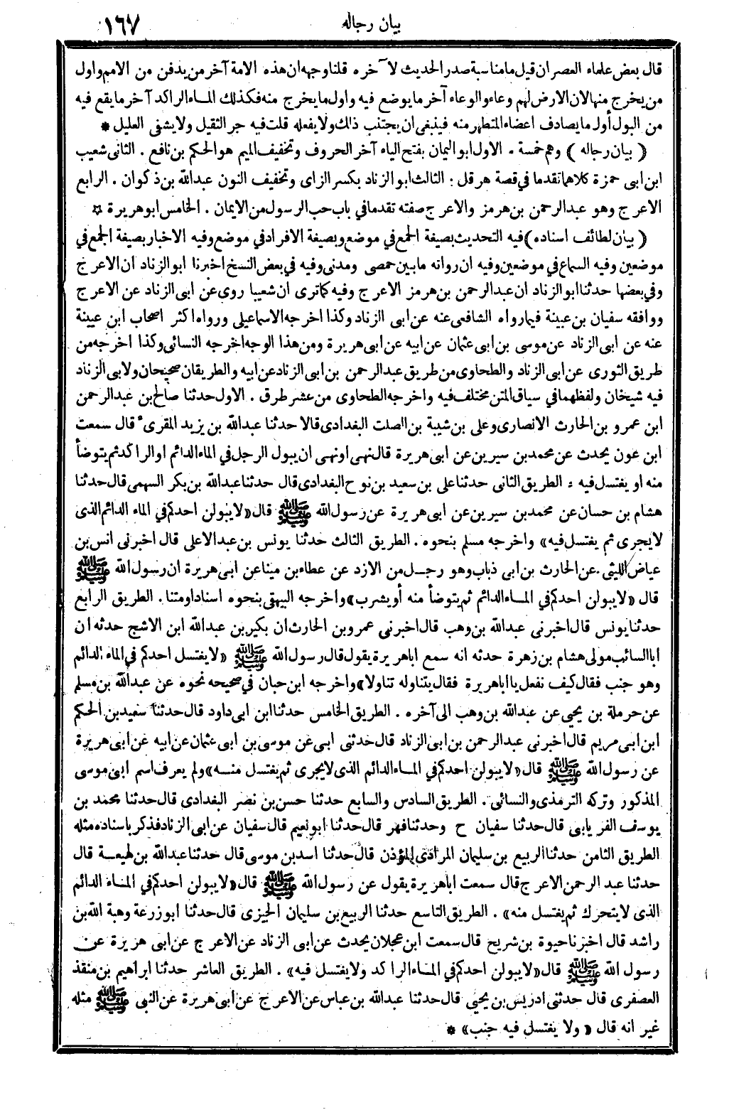 وَأخرجه الطَّحَاوِيّ من عشر طرق: الأول: حَدثنَا صَالح عبد الرحمان بن عَمْرو الْحَارِث الْأنْصَارِيّ، وَعلي بن شيبَة بن الصلات الْبَغْدَادِيّ قَالَا حَدثنَا عبد الله بن يزِيد المقرىء، قَالَ: سَمِعت ابْن عون يحدث عَن مُحَمَّد بن سِيرِين عَن أبي هُرَيْرَة. قَالَ: نهى أَو نهيّ أَن يَبُول الرجل فِي المَاء الدَّائِم، أَو الراكد ثمَّ يتَوَضَّأ مِنْهُ أَو يغْتَسل فِيهِ. الطَّرِيق الثَّانِي: حَدثنَا عَليّ بن سعيد بن نوح الْبَغْدَادِيّ، قَالَ: حَدثنَا عبد الله بن بكر السَّهْمِي، قَالَ: حَدثنَا هِشَام بن حسان عَن مُحَمَّد بن سِيرِين عَن أبي هُرَيْرَة عَن رَسُول الله صلى الله عَلَيْهِ وَسلم، قَالَ: (لَا يَبُول أحدكُم فِي المَاء الدَّائِم الَّذِي لَا يجْرِي ثمَّ يغْتَسل فِيهِ) وَأخرجه مُسلم بِنَحْوِهِ. الطَّرِيق الثَّالِث: حَدثنَا يُونُس بن عبد الْأَعْلَى، قَالَ: أَخْبرنِي أنس بن عِيَاض اللَّيْثِيّ عَن الْحَارِث بن أبي ذياب، وَهُوَ رجل من الأزد، عَن عَطاء بن مينا عَن أبي هُرَيْرَة أَن رَسُول الله صلى الله عَلَيْهِ وَسلم قَالَ: (لَا يبولن أحدكُم فِي المَاء الدَّائِم ثمَّ يتَوَضَّأ مِنْهُ أَو يشرب) وَأخرجه الْبَيْهَقِيّ بِنَحْوِهِ إِسْنَادًا ومتناً. الطَّرِيق الرَّابِع: حَدثنَا يُونُس، قَالَ: أَخْبرنِي عبد الله بن وهب، قَالَ: أَخْبرنِي عَمْرو بن الْحَارِث أَن بكير بن عبد الله بن الْأَشَج حَدثهُ أَن أَبَا السَّائِب، مولى هِشَام بن زهرَة؟ حَدثهُ أَنه سمع أَبَا هُرَيْرَة يَقُول: قَالَ رَسُول الله صلى الله عَلَيْهِ وَسلم: (لَا يغْتَسل أحدكُم فِي المَاء، الدَّائِم وَهُوَ جنب فَقَالَ: كَيفَ تفعل يَا أَبَا هُرَيْرَة؟ فَقَالَ: يتَنَاوَلهُ تناولاً) وَأخرجه ابْن حبَان فِي (صَحِيحه) نَحوه عَن عبد الله بن مُسلم عَن جرملة بن يحيى عَن عبد الله بن وهب إِلَى آخِره. الطَّرِيق الْخَامِس: حَدثنَا ابْن أبي دَاوُد، قَالَ: حَدثنَا سعيد بن الحكم ابْن أبي مَرْيَم، قَالَ: أَخْبرنِي عبد الرَّحْمَن بن أبي الزِّنَاد، قَالَ: حَدثنِي أبي عَن مُوسَى بن أبي عُثْمَان عَن أَبِيه عَن أبي هُرَيْرَة عَن رَسُول الله صلى الله عَلَيْهِ وَسلم، قَالَ: (لَا يبولن أحدكُم فِي المَاء الدَّائِم الَّذِي لَا يجْرِي ثمَّ يغْتَسل مِنْهُ) وَلم يعرف قَاسم اسْم: أبي مُوسَى، الْمَذْكُور وَتَركه التِّرْمِذِيّ وَالنَّسَائِيّ. الطَّرِيق السَّادِس وَالسَّابِع: حَدثنَا حسن بن نَص الْبَغْدَادِيّ، قَالَ: حَدثنَا مُحَمَّد بن يُوسُف الْفرْيَابِيّ، قَالَ: حَدثنَا سُفْيَان (ح) وَحدثنَا فهر، قَالَ: حَدثنَا أَبُو نعيم، قَالَ: سُفْيَان عَن أبي الزِّنَاد، الطَّرِيق الثَّامِن: حَدثنَا الرّبيع بن سُلَيْمَان الْمرَادِي الْمُؤَذّن قَالَ: حَدثنَا أَسد بن مُوسَى قَالَ: حَدثنَا عبد الله بن لهيفة قَالَ: فَذكر بِإِسْنَادِهِ مثله، حَدثنَا عبد الرَّحْمَن الْأَعْرَج، قَالَ: سَمِعت أَبَا هُرَيْرَة يَقُول عَن رَسُول الله صلى الله عَلَيْهِ وَسلم، قَالَ: (لَا يبولن أحدكُم فِي المَاء الدَّائِم الَّذِي لَا يَتَحَرَّك ثمَّ يغْتَسل مِنْهُ) . الطَّرِيق التَّاسِع: حَدثنَا الرّبيع بن سُلَيْمَان الجيزي، قَالَ: حَدثنَا أَبُو زرْعَة وَهبة الله بن رَاشد، قَالَ: أخبرنَا حَيْوَة بن شُرَيْح، قَالَ: سَمِعت ابْن عجلَان يحدث عَن أبي الزِّنَاد عَن الْأَعْرَج عَن أبي هُرَيْرَة عَن رَسُول الله صلى الله عَلَيْهِ وَسلم، قَالَ: (لَا يبولن أحدكُم فِي المَاء الراكد وَلَا يغْتَسل فِيهِ) . الطَّرِيق الْعَاشِر: حَدثنَا إِبْرَاهِيم بن منقذ الْعُصْفُرِي؟ قَالَ: حَدثنِي إِدْرِيس بن يحيى، قَالَ: حَدثنَا عبد الله بن عَبَّاس عَن الْأَعْرَج عَن أبي هُرَيْرَة عَن النَّبِي صلى الله عَلَيْهِ وَسلم مثله، غير أَنه قَالَ: (وَلَا يغْتَسل فِيهِ جنب) .