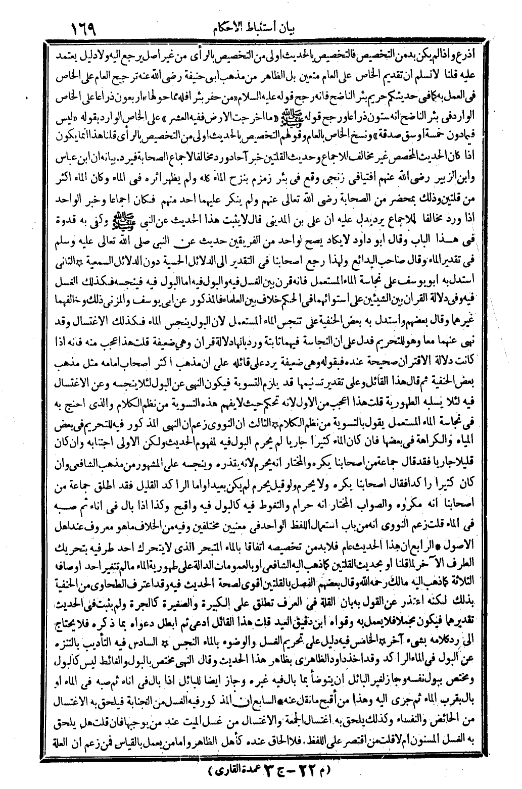 أَذْرع وَإِذا لم يكن بُد من التَّخْصِيص فالتخصيص بِالْحَدِيثِ أولى من التَّخْصِيص بِالرَّأْيِ من غير أصل يرجع إِلَيْهِ، وَلَا دَلِيل يعْتَمد عَلَيْهِ. قُلْنَا: لَا تسلمك أَن تَقْدِيم الْخَاص على الْعَام مُتَعَيّن، بل الظَّاهِر من مهب أبي حنيفَة، رَضِي الله عَنهُ تَرْجِيح الْعَام على الْخَاص فِي الْعَمَل بِهِ، كَمَا فِي حديثكم حَرِيم لئر الناضح فَإِنَّهُ رجح قَوْله: عَلَيْهِ السَّلَام: من حفر بِئْرا فَلهُ مِمَّا حولهَا أَرْبَعُونَ ذِرَاعا على الْخَاص الْوَارِد فِي بِئْر الناضح أَنه سِتُّونَ ذِرَاعا وَرجح قَوْله صلى الله عَلَيْهِ وَسلم: (مَا أخرجت الأَرْض فَفِيهِ الْعشْر) على الْخَاص الْوَارِد بقوله: (لَيْسَ فِيمَا دون خَمْسَة أوسق صدقه) وَنسخ الْخَاص بِالْعَام، قَوْلهم: التَّخْصِيص بِالْحَدِيثِ أولى من التَّخْصِيص بِالرَّأْيِ قُلْنَا: هَذَا إِنَّمَا يكون إِذا كَانَ الحَدِيث الْمُخَصّص غير مُخَالف للْإِجْمَاع، وَحَدِيث الْقلَّتَيْنِ خير آحَاد ورد مُخَالفا لإِجْمَاع الصَّحَابَة فَيرد بَيَانه أَن ابْن عَبَّاس وَابْن الزبير رَضِي الله عَنْهُم فتيا فِي زنجي وَقع فِي بِئْر زَمْزَم، بنزج المَاء كُله، وَلم يظْهر أَثَره فِي المَاء، وَكَانَ المَاء أَكثر من قُلَّتَيْنِ، وَذَلِكَ بِمحضر من الصَّحَابَة رَضِي الله تَعَالَى عَنْهُم، وَلم يُنكر عَلَيْهِمَا أحد مِنْهُم، فَكَانَ إِجْمَاعًا وَخبر الْوَاحِد إِذا ورد مُخَالفا للْإِجْمَاع يرد، يدل عَلَيْهِ أَن عَليّ بن الْمَدِينِيّ قَالَ: لَا يثبت هَذَا الحَدِيث عَن النَّبِي صلى الله عَلَيْهِ وَسلم، وَكفى بِهِ قدوة فِي هَذَا الْبَاب وَقَالَ أَبُو دَاوُد، لَا يكَاد يَصح لوَاحِد من الْفَرِيقَيْنِ حَدِيث عَن النَّبِي صلى الله تَعَالَى عَلَيْهِ وَسلم، فِي تَقْدِير المَاء. وَقَالَ صَاحب (الْبَدَائِع) وَلِهَذَا رَجَعَ أَصْحَابنَا فِي التَّقْدِير إِلَى الدَّلَائِل الحسية دون الدَّلَائِل السمعية.