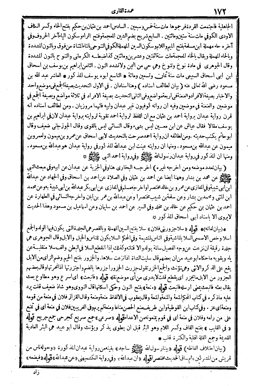 الْجَاهِلِيَّة فاجتمعت القردة فرجموها، مَاتَ سنة خمس وَسبعين. السَّادِس: أَحْمد بن عُثْمَان بن حَكِيم، بِفَتْح الْخَاء وَكسر الْكَاف: الأودي الْكُوفِي، مَاتَ سنة سِتِّينَ وَمِائَتَيْنِ. السَّابِع: شُرَيْح، بِضَم الشين الْمُعْجَمَة وَفتح الرَّاء وَسُكُون الْيَاء آخر الْحُرُوف فِي آخِره حاء مُهْملَة، ابْن مسلمة، بِفَتْح الْمِيم وَاللَّام وَسُكُون السِّين الْمُهْملَة الْكُوفِي التنوحي بِالتَّاءِ الْمُثَنَّاة من فَوق وبالنون الْمُشَدّدَة وَبِالْحَاءِ الْمُهْملَة وَيُقَال بِالْخَاءِ الْمُعْجَمَة مَاتَ سنة اثْنَتَيْنِ وَعشْرين وَمِائَتَيْنِ كَذَا ضَبطه الْكرْمَانِي والتنوح بالنُّون الْمُشَدّدَة وَقَالَ الْجَوْهَرِي، فِي مَادَّة، نوخ: وتنوخ، وَهِي حَيّ من الْيمن، وَلَا تشدد النُّون، الثَّامِن: إِبْرَاهِيم بن يُوسُف بن إِسْحَاق ابْن أبي إِسْحَاق السبيعِي، مَاتَ سنة ثَمَان وَتِسْعين وَمِائَة التَّاسِع: أَبوهُ يُوسُف الْمَذْكُور الْعَاشِر: عبد الله بن مَسْعُود، رَضِي الله تَعَالَى عَنهُ. بَيَان لطائف إِسْنَاده وَهنا إسنادان فِي الأول: التحديث بِصِيغَة الْجمع فِي مَوضِع وَاحِد والإخابر بِصِيغَة الْإِفْرَاد والعنعنة فِي أَرْبَعَة وَاضع. وَفِي الثَّانِي: التحديث بِصِيغَة الْإِفْرَاد فِي ثَلَاثَة مَوَاضِع، وبصيغة الْجمع فِي موضِعين والعنعنة فِي موضِعين، وَفِيه: أَن رُوَاته كوفيون غير عَبْدَانِ وَأَبِيهِ فَإِنَّهُمَا مروزيان. وَمن لطائف إِسْنَاده، أَنه قرن رِوَايَة عَبْدَانِ بِرِوَايَة أَحْمد بن عُثْمَان، مَعَ أَن اللَّفْظ لرِوَايَة أَحْمد تَقْوِيَة لروايته بِرِوَايَة عَبْدَانِ، لِأَن فِي إِبْرَاهِيم بن يُوسُف مقَالا، فَقَالَ عَيَّاش عَن ابْن معِين: لَيْسَ بِشَيْء، وَقَالَ النَّسَائِيّ: لَيْسَ بِالْقَوِيّ، وَقَالَ الْجوزجَاني: ضَعِيف. وَقَالَ أَبُو حَاتِم: يكْتب حَدِيثه وَمن لطائفه: أَن رِوَايَة أَحْمد صرحت بِالتَّحْدِيثِ لأبي إِسْحَاق عَن عَمْرو بن مَيْمُون، ولعمرو بن مَيْمُون عَن عبد الله بن مَسْعُود. وَمِنْهَا: أَن رِوَايَته عينت ابْن عبد الله الْمَذْكُور فِي رِوَايَة عَبْدَانِ: وَهُوَ عبد الله بن مَسْعُود. وَمِنْهَا: أَن الْمَذْكُور فِي رِوَايَة عَبْدَانِ رَسُول الله صلى الله عَلَيْهِ وَسلم، وَفِي روياة أَحْمد النَّبِي صلى الله عَلَيْهِ وَسلم.