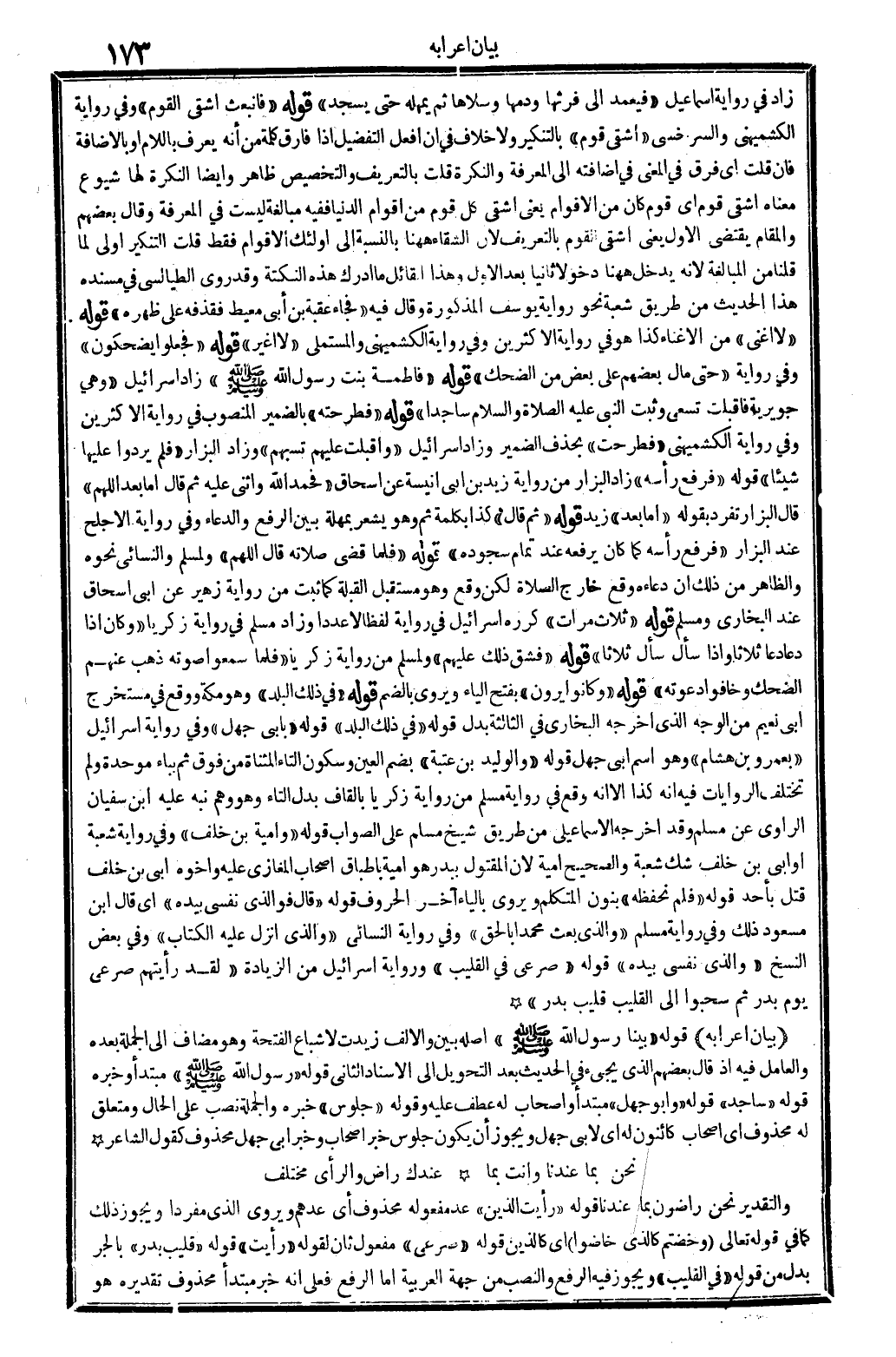بَيَان إعرابه قَوْله: (بَينا رَسُول الله صلى الله عَلَيْهِ وَسلم) أَصله: بَين، وَالْألف زيدت لإشباع الفتحة، وَهُوَ مُضَاف إِلَى الْجُمْلَة بعده، وَالْعَامِل فِيهِ إِذْ قَالَ بَعضهم الَّذِي يَجِيء فِي الحَدِيث بعد التَّحْوِيل إِلَى الْإِسْنَاد الثَّانِي. قَوْله: (رَسُول الله صلى الله عَلَيْهِ وَسلم) مُبْتَدأ وَخبر قَوْله: (ساجد) قَوْله: (وَأَبُو جهل) مُبْتَدأ (وَأَصْحَاب لَهُ) عطف عَلَيْهِ وَقَوله: (جُلُوس) خَبره، وَالْجُمْلَة نصب على الْحَال، ومتعلق، لَهُ مَحْذُوف أَي: أَصْحَاب كائنون لَهُ، أَي: لأبي جهل، وَيجوز أَن يكون، جُلُوس خبر أَصْحَاب، وَخبر أبي جهل مَحْذُوف كَقَوْل الشَّاعِر: