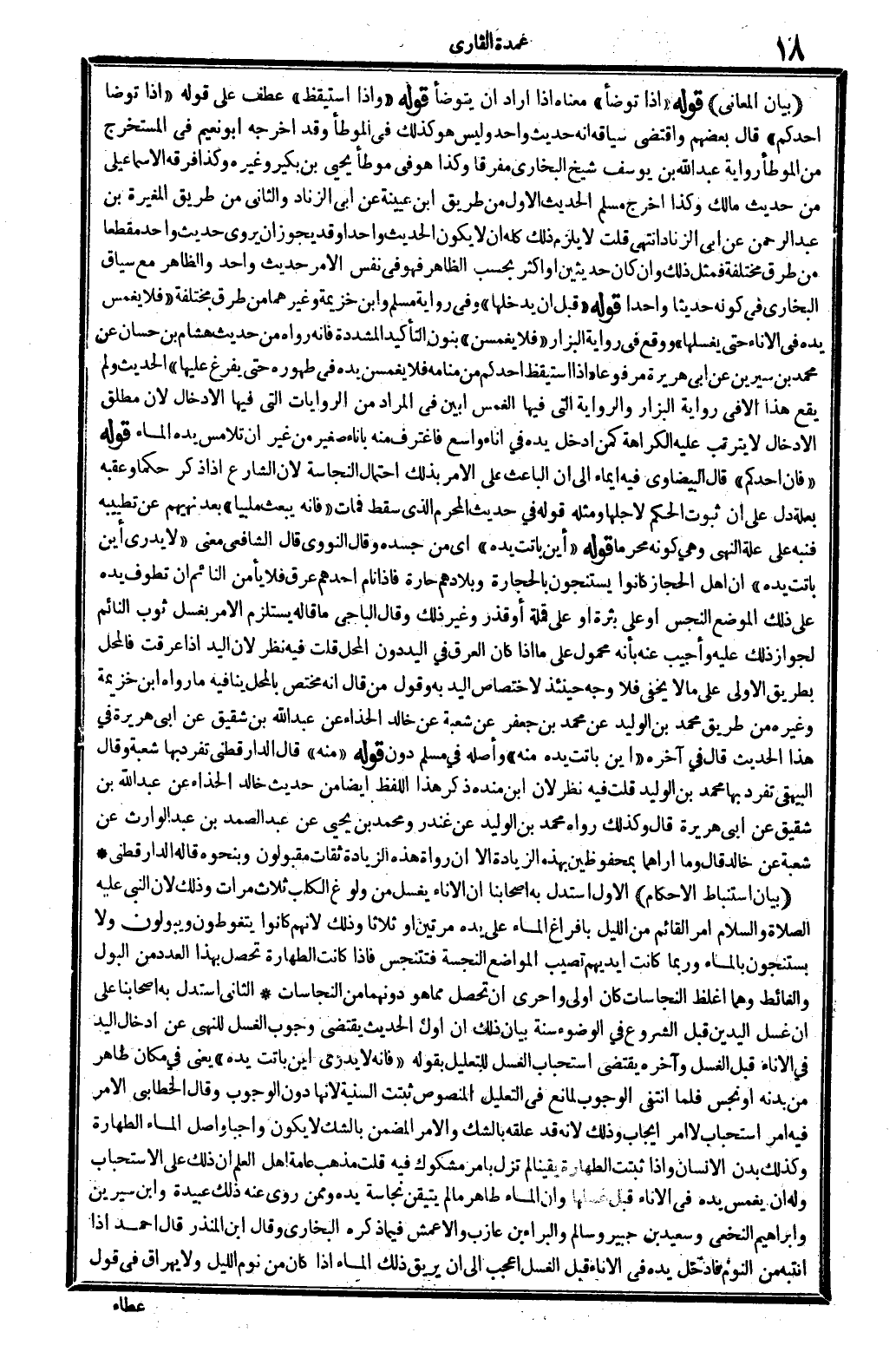 بَيَان الْمعَانِي قَوْله: (إِذا تَوَضَّأ) مَعْنَاهُ: إِذا أَرَادَ أَن يتَوَضَّأ. قَوْله: (وَإِذا اسْتَيْقَظَ) عطف على قَوْله: (إِذا توضا أحدكُم) قَالَ بَعضهم: وَاقْتضى سِيَاقه أَنه حَدِيث وَاحِد وَلَيْسَ هُوَ كَذَلِك فِي (الْمُوَطَّأ) ، وَقد أخرجه أَبُو نعيم فِي (الْمُسْتَخْرج من الْمُوَطَّأ) رِوَايَة عبد الله بن يُوسُف شيخ البُخَارِيّ مفرقاً، وَكَذَا هُوَ فِي (موطأ يحيى بن بكير) وَغَيره، وَكَذَا فرقه الْإِسْمَاعِيلِيّ من حَدِيث مَالك، وَكَذَا أخرج مُسلم الحَدِيث الأول من طَرِيق ابْن عُيَيْنَة عَن أبي الزِّنَاد، وَالثَّانِي من طَرِيق الْمُغيرَة بن عبد الرَّحْمَن عَن ابي الزِّنَاد. انْتهى. قلت: لَا يلْزم ذَلِك كُله أَن لَا يكون الحَدِيث وَاحِدًا، وَقد يجوز أَن يروي حَدِيث وَاحِد مقطعاً من طرق مُخْتَلفَة، فَمثل ذَلِك، وَإِن كَانَ حديثين أَو أَكثر بِحَسب الظَّاهِر، فَهُوَ فِي نفس الْأَمر حَدِيث وَاحِد، وَالظَّاهِر مَعَ سِيَاق البُخَارِيّ فِي كَونه حَدِيثا وَاحِدًا. قَوْله: (قبل أَن يدخلهَا) ، وَفِي رِوَايَة مُسلم وَابْن خُزَيْمَة وَغَيرهمَا من طرق مُخْتَلفَة: (فَلَا يغمس يَده فَلَا فِي الْإِنَاء حَتَّى يغسلهَا) ، وَوَقع فِي رِوَايَة الْبَزَّار: (فَلَا يعمسن) ، بنُون التأكيدة الْمُشَدّدَة، فَإِنَّهُ رَوَاهُ من حَدِيث هِشَام بن حسان عَن مُحَمَّد بن سِيرِين عَن أبي هُرَيْرَة مَرْفُوعا: (إِذا اسْتَيْقَظَ أحدكُم من مَنَامه فَلَا يغمس يَده فِي طهوره حَتَّى يفرغ عَلَيْهَا) الحَدِيث وَلم يَقع هَذَا إلاَّ فِي رِوَايَة الْبَزَّار، وَالرِّوَايَة الَّتِي فِيهَا: الغمس، أبين فِي المُرَاد من الرِّوَايَات الَّتِي فِيهَا: الإدخال، لِأَن مُطلق الإدخال لَا يَتَرَتَّب عَلَيْهِ الْكَرَاهَة، كمن أَدخل يَده فِي إِنَاء وَاسع فاغترف مِنْهُ بِإِنَاء صَغِير من غير أَن تلامس يَده الْمسَاء. قَوْله: (فَإِن أحدكُم) قَالَ الْبَيْضَاوِيّ: فِيهِ إِيمَاء إِلَى أَن الْبَاعِث على الْأَمر بذلك احْتِمَال النَّجَاسَة، لِأَن الشَّارِع إِذا ذكر حكما وعقبه بعلة دلّ على أَن ثُبُوت الحكم لأَجلهَا، وَمثله قَوْله فِي حَدِيث الْمحرم الَّذِي سقط فَمَاتَ: (فَإِنَّهُ يبْعَث ملبياً) ، بعد نهيهم عَن تطييبه فنبه على عِلّة النَّهْي وَهِي كَونه محرما. قَوْله: (أَيْن باتت يَده) أَي: من جسده. وَقَالَ النَّوَوِيّ: قَالَ الشَّافِعِي: معنى (لَا يدْرِي أَيْن باتت يَده) أَن أهل الحجار كَانُوا يستنجون بِالْحِجَارَةِ وبلادهم حارة، فَإِذا نَام أحدهم عرق، فر يَأْمَن من النَّائِم أَن تَطوف يَده على ذَلِك الْموضع النَّجس أَو على بثرة أَو على قملة أَو قذر وَغير ذَلِك. وَقَالَ الْبَاجِيّ: مَا قَالَه يسْتَلْزم الْأَمر بِغسْل ثوب النَّائِم لجَوَاز ذَلِك عَلَيْهِ، وَأجِيب عَنهُ: بِأَنَّهُ مَحْمُول على مَا إِذا كَانَ الْعرق فِي اليددون الْمحل. قلت: فِيهِ نظر، لِأَن الْيَد إِذا عرقت فالمحل بطرِيق الأولى على مَا لَا يخفي فَلَا وَجه حِينَئِذٍ لاخْتِصَاص الْيَد بِهِ. وَقَول من قَالَ: إِنَّه مُخْتَصّ بِالْمحل يُنَافِيهِ مَا رَوَاهُ ابْن خُزَيْمَة وَغَيره من طَرِيق مُحَمَّد بن الْوَلِيد عَن مُحَمَّد بن جَعْفَر عَن شُعْبَة عَن خَالِد الْحذاء عَن عبد الله بن شَقِيق عَن أبي هُرَيْرَة فِي هَذَا الحَدِيث، قَالَ فِي آخِره: (أَيْن باتت يَده مِنْهُ) ، وَأَصله فِي مُسلم: دون: قَوْله: (مِنْهُ) . قَالَ الدَّارَقُطْنِيّ: تفرد بهَا شُعْبَة. وَقَالَ الْبَيْهَقِيّ: تفرد بهَا مُحَمَّد بن الْوَلِيد. قلت: فِيهِ نظر لِأَن ابْن مَنْدَه ذكر هَذَا اللَّفْظ أَيْضا من حَدِيث خَالِد الْحذاء عَن عبد الله بن شَقِيق عَن أبي هُرَيْرَة، قَالَ: وَكَذَلِكَ رَوَاهُ مُحَمَّد بن الْوَلِيد عَن غنْدر، وَمُحَمّد بن يحيى عَن عبد الصَّمد بن عبد الْوَارِث عَن شُعْبَة عَن خَالِد. قَالَ: وَمَا أراهما بمحفوظين بِهَذِهِ الزِّيَادَة إلاَّ أَن رُوَاة هَ